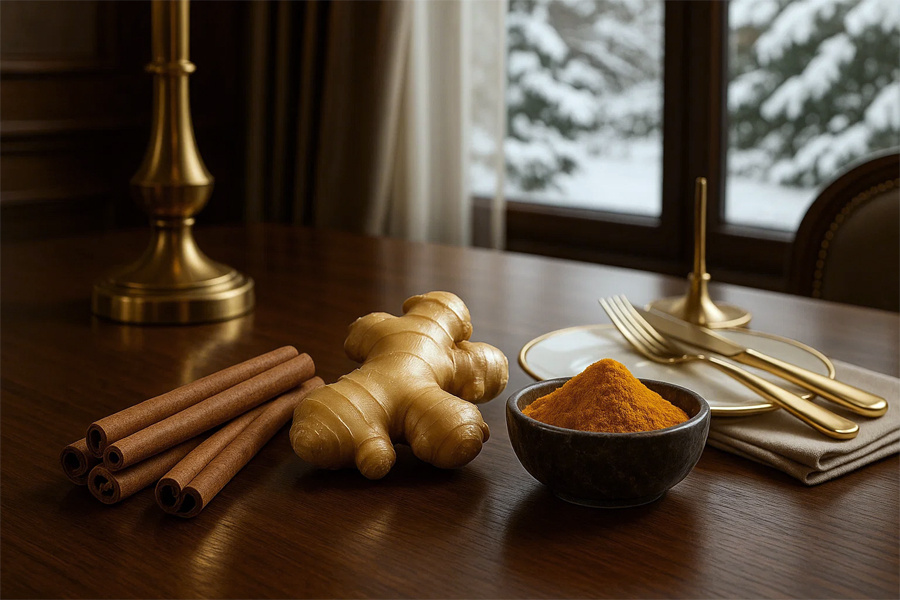 Декабрь — это время, когда природа замедляется, а тело ищет тепло. В аюрведе считается, что ранняя зима относится к сезону Хеманта, когда огонь пищеварения особенно мощный, но внешние ткани легко теряют тепло и эластичность. В такие месяцы специи становятся не просто вкусом, а лекарством и защитой. 1. Имбирь — корень зимнего огня и самая важная зимняя специя. Он одновременно разжигает агни и прогревает каналы, не вызывая раздражения, как острые специи. Почему имбирь важен в декабре: усиливает пищеварение, уменьшает слизь, разгоняет холод и вялость, поддерживает циркуляцию. «Имбирь — лучший среди разогревающих и разжигающих агни средств.»