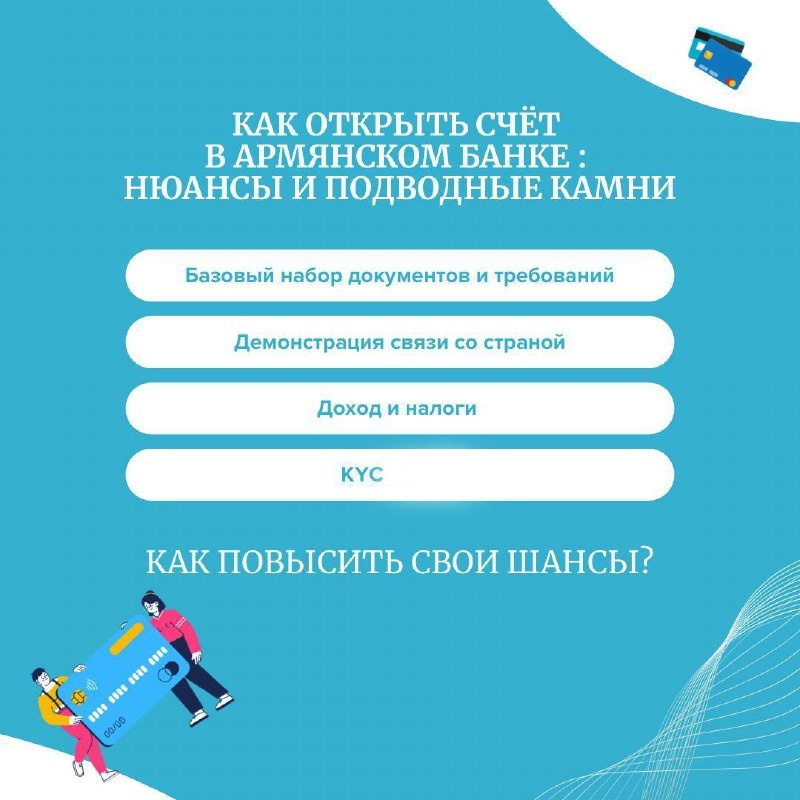 Как открыть счёт в армянском банке физическому лицу: нюансы и подводные камни Открытие банковского счёта в Армении для физических лиц — задача, которая кажется простой лишь на первый взгляд. Несмотря на схожесть с процедурой для индивидуальных предпринимателей, здесь есть свои особенности, а уровень отказов по заявкам — заметно выше. Базовый набор документов и требований В большинстве случаев, чтобы подать заявку на открытие счёта, вам понадобятся: • Паспорт (подходит как загранпаспорт, так и внутренний российский) + Нотариально заверенный перевод паспорта; • Социальная карта (она же SSN); • Банковские выписки за последние 6–12 месяцев — из страны, где вы ранее обслуживались; • Документы, подтверждающие источник дохода и факт уплаты налогов (например, справка 2-НДФЛ или аналог); • Подтверждение планов остаться в стране — например, договор аренды или временная регистрация; Почему важно продемонстрировать связь со страной Банки не приветствуют «карточных туристов», когда клиент открыв