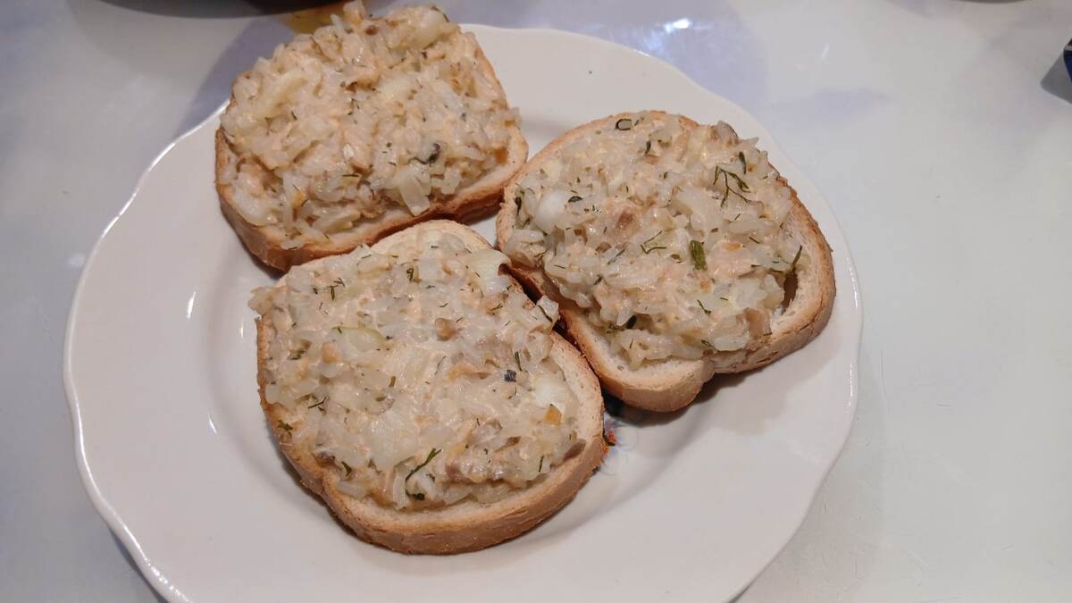 Бутерброды с рисом и рыбной консервой Нам понадобится батон, рис, любая рыбная консерва, репчатый лук, майонез, сырое яйцо, любая зелень если есть. Начинка. В отварной рис добавляем рыбную консерву (любую), крошем мелко репчатый лук, ложка майонеза, разбиваем одно яйцо, добавляем зелень любую по вкусу (можно и без неё). На батон наказываем начинку и отправляем в разогретую духовку на 15-20 минут. Приятного аппетита!!!