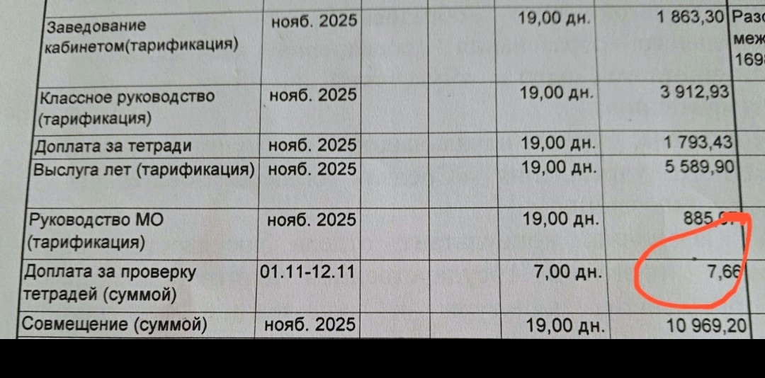 Иногда диву даёшься, читая чужие зарплатные квиточки. А ведь это не просто бумажки, это ведомость оплаты человеческого труда за часы работы, это огорчение и непонимание. А как иначе назвать те цифры, что мы видим на квитке. Особенно бросается в глаза сумма в 7 рублей 66 копеек. Что же это? Это доплата к основной зарплате за проверку тетрадей с 1.11 по 12.11, это за 7 рабочих дней. По 1 рублю в день. А может это доплата к доплате за тетради, обозначенной выше в размере 1793, 43 рубля. Правда там написано иное: доплата за тетради за 19 отработанных дней, а тут только за 7 дней. В месяце не может быть 26 рабочих дней, если учитель работает по пятидневке. Скорее всего, учитель 7 дней был на замене и проверял тетради учеников за 1 рубль и 9 копеек в день. Вот и получается, что учителя проверяют тетради, работая на замене, бесплатно или вовсе не проверяют. Выливается это в понижение качества обучения. Кроме этого дети расхолаживаются, перестают выполнять домашние работы, пропадает интерес
