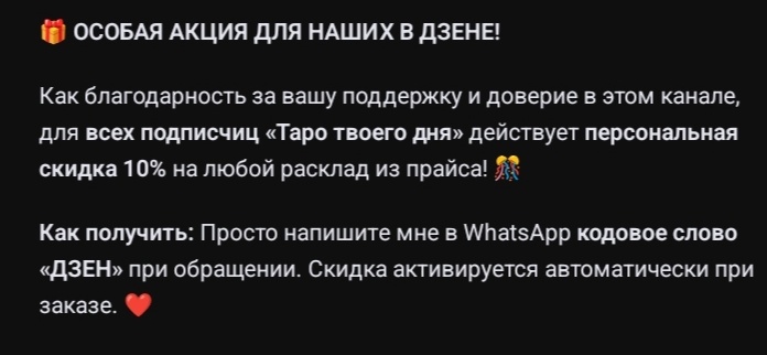 Девочки, всем привет! 💫 Многие из вас писали мне в личные сообщения с вопросами, на которые в общем посте не ответишь. Спасибо за это огромное доверие! Я оформила то, что давно назрело — мои личные расклады-консультации. Теперь можно заказать не просто «гадание», а глубокий разбор именно вашей ситуации по конкретным, важным для вас вопросам. Что это такое? Это сеанс таро-терапии. Мы не спрашиваем «что будет?». Мы разбираем «что происходит?», «почему?» и «какой следующий шаг?» — чтобы вы получили не предсказание, а ясность и план. Как это работает? 1. Вы пишете мне в WhatsApp или МАХ: +7 (918) 243-95-88, описываете ситуацию. 2. Я подбираю подходящий расклад, или мы создаём его вместе под ваш запрос. 3. Вы получаете детальный текстовый разбор и фотографию ваших карт. ✨ Ниже — мои авторские расклады. Выберите тот, что откликается, или задайте свой вопрос. Готова помочь вам найти ваш путь к ясности. 💖 💖 💖 💖 💖 💖 💖 💖 💖 💖 📲 Пишите в WhatsApp: +