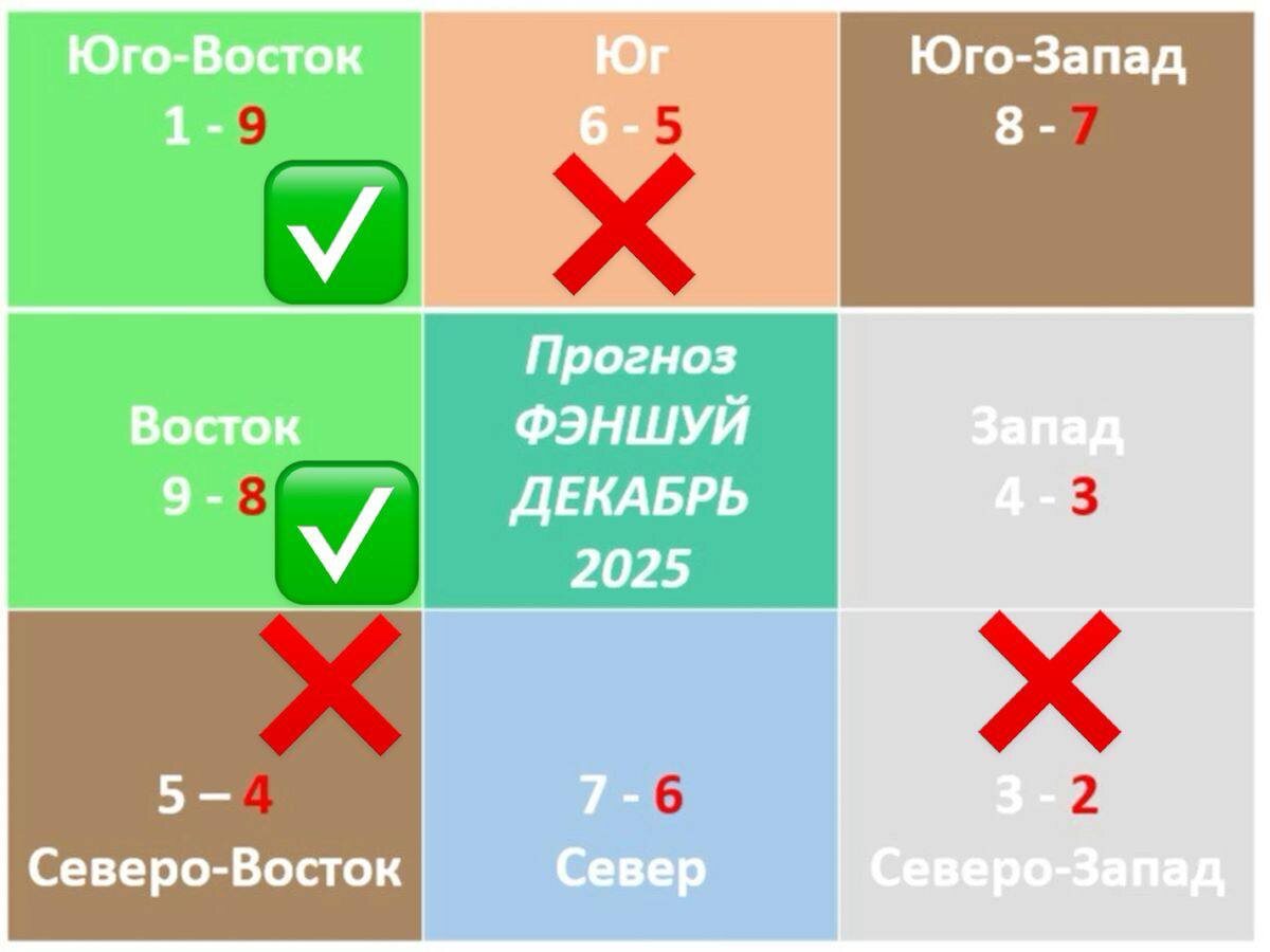 🌙 ПРОГНОЗ ПО ФЭНШУЙ НА МЕСЯЦ ЗЕМЛЯНОЙ КРЫСЫ (7 декабря 2025 — 4 января 2026) Дорогие подписчики! Пока год Деревянной Змеи (2025) движется к завершению, энергию месяца огненной свиньи сменяет месяц Земляной Крысы. Это время создания правильной атмосферы для встречи Нового 2026 года. Давайте грамотно используем эти переходные энергии! 🟢 БЛАГОПРИЯТНЫЕ СЕКТОРА (Главные точки силы в декабре) 1. ВОСТОК (Звезда 8 — Богатство) · Энергия: Главный финансовый магнит месяца! Звезда 8 в секторе Дерева идеально раскрывает потенциал роста доходов. · Как использовать: Ваша ключевая точка для работы, фриланса, финансового планирования, привлечения клиентов и выгодных сделок. Все важные денежные действия совершайте здесь. 2. ЮГО-ВОСТОК (Звезда 9 — Удача) · Энергия: Ярчайшая и самая благоприятная звезда периода! Звезда 9 в секторе Дерева создает энергию признания, праздника, радости и вдохновения. Это «звезда будущего процветания». · Как использовать: Идеальное место для всех праздничных меропри