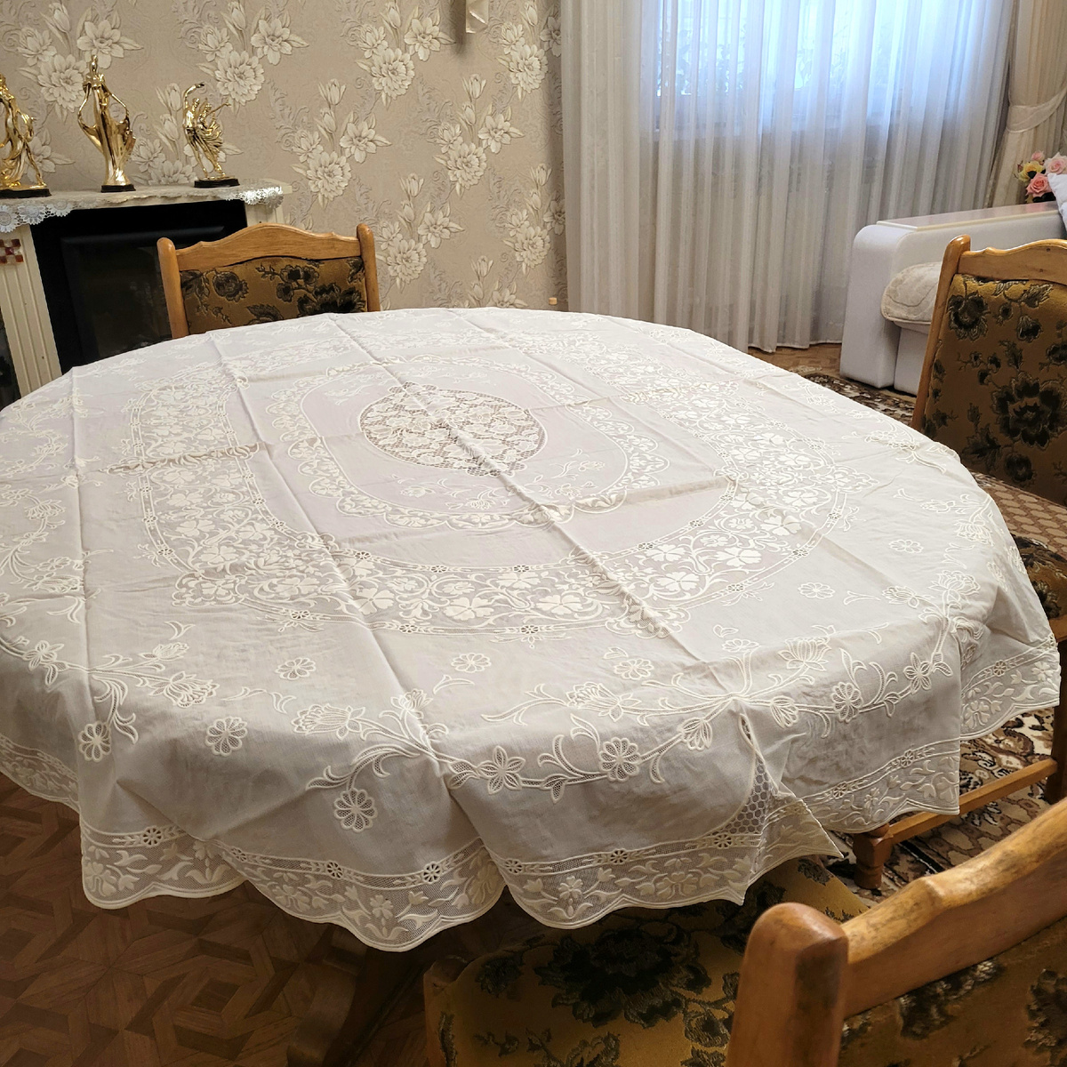 Здравствуйте, дорогие друзья! Вчера я была занята и не смогла написать статью. Я решила отмыть плитку в ванной комнате. Её площадь — 12 квадратных метров, все стены и пол покрыты плиткой. Раньше я каждый год чистила швы щеткой с чистящим средством. Но несколько лет этим не занималась, и они стали серыми и даже черными. Поэтому вчера я решила взяться за уборку. Протерла потолок и стены, а ванная засияла как новая. Я осталась очень довольна результатом. Кроме того, я забрала скатерти на Wildberries. Они клеенчатые: одна с бежевым оттенком, другая белая. Эта овальная скатерть для гостей. Моя старая уже отслужила. Эта скатерть клеенчатая. Я планировала купить тканевую, но Машка часто забирается на стол грязными лапами. Клеенчатую можно просто протереть, а тканевую пришлось бы стирать. Мне и эта скатерть понравилась. В последнее время я стараюсь выбирать то, что удобнее для меня. Так же на Озоне заказала наборы себе и по набору сестрам на Новый год. Я очень часто покупаю такой крем и