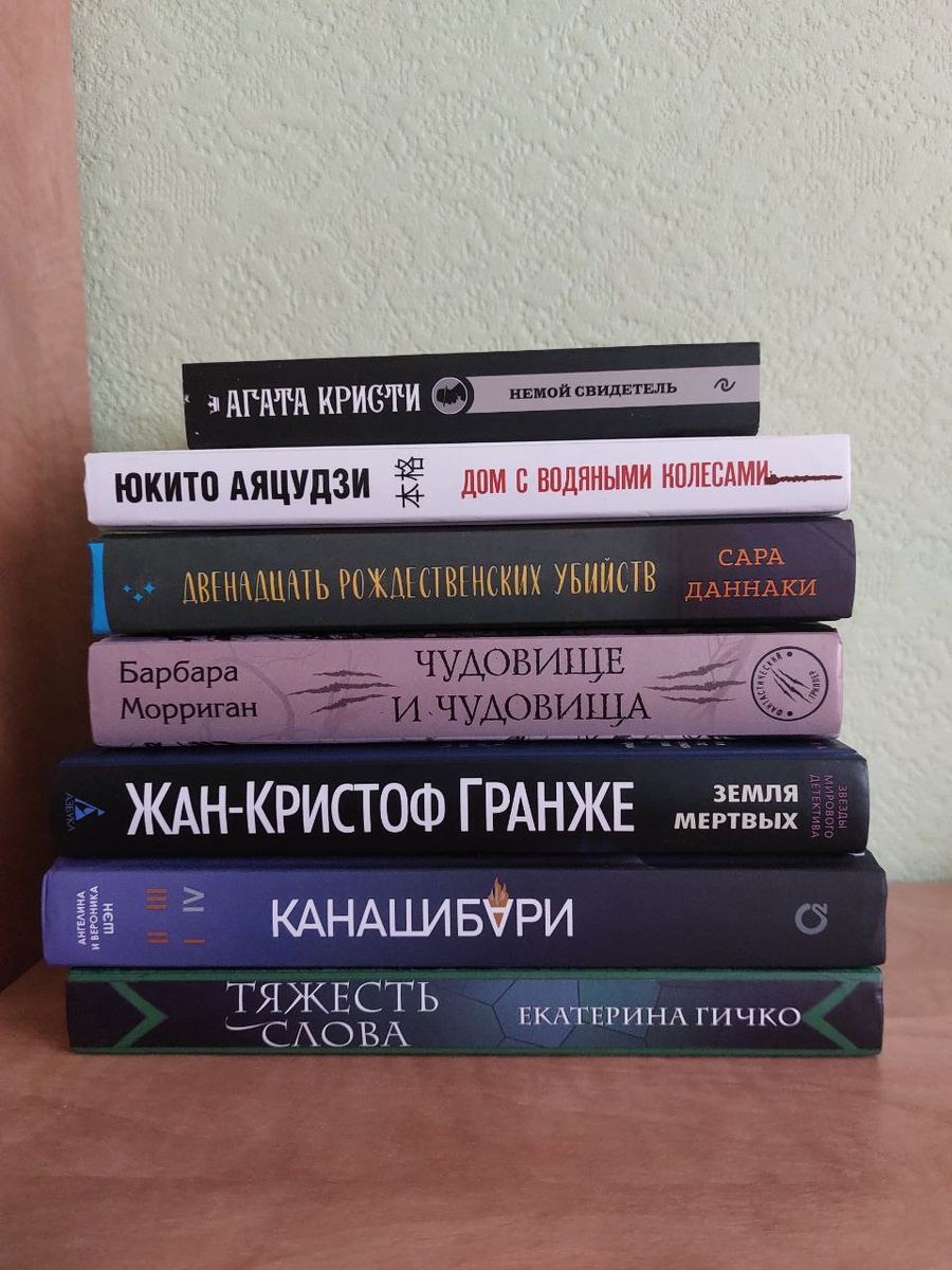 🌟 ▫️▫️▫️▫️▫️▫️▫️▫️▫️▫️▫️ ▫️▫️▫️▫️▫️ 🌟 Сразу говорю, что это не все книги, у меня ещё 3 лежат в Читай-городе, но никак не могу за ними доехать. 1. Агата Кристи- Немой свидетель 2. Юкито Аяцудзи- Дом с водяными колёсами 3. Сара Даннаки- Двенадцать рождественских убийств 4. Барбара Морриган- Чудовище и чудовища 5. Жан-Кристоф Гранже- Земля мёртвых 6. Ангелина и Вероника Шэн- Канашибари 7. Екатерина Гичко- Тяжесть слова