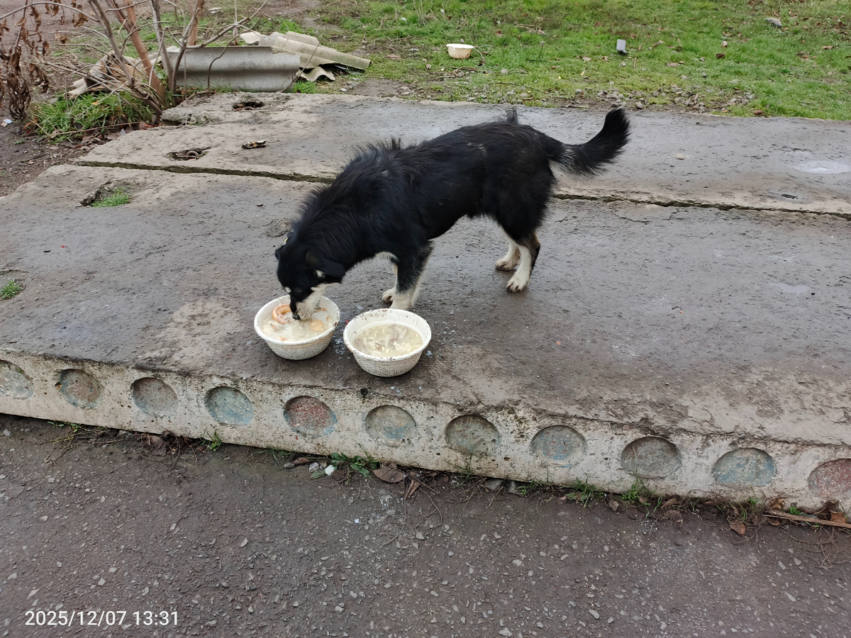 Добрый вечер ! Пошла я днём кормить Кукусю ,она бежит,встречает. На ней попона и вдруг садится и заваливается...у меня всё опустилось..думала всё... Оказывается ей мешала попона . Я сняла и она нормально побежала. Кушала уже без попоны. Кушала хорошо и я со спокойной душой пошла к Лилии Михайловне на чайковский . Попили чай и я отнесла ведро домой ,а потом пошли на полтинник по магазинам с Юлей,Сашей и т Галей . Ну и конечно с нами пошла Белочка. Сначала зашли в аптеку,я купила леденцы от кашля ,Юля тоже что то купила. Потом в Фикс прайс ,в Чижик ,в Пятёрочку. После Пятёрочки пошли в мясной. Хотела костей купить. Увидели врзле дерева кота,думали он орет,а оказывается кошка на дереве сидела плакала. Кот нас испугался и убежал . А кошку вам сейчас покажу. Я же миски купила в фикс прайсе,а в Пятёрочке несколько паучей влажного корма и дала кошечка,миску оставила,пусть ест. Если она там живёт то кто нибудь может ещё покормит. А может завтра прогуляюсь и кашу отнесу. Сейчас пойду в