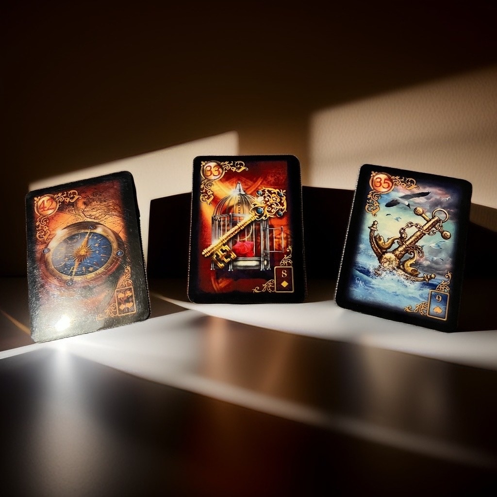 Три карты, разложенные рядом, создают ощущение навигации, поиска выхода и надежды на пристань. Компас, указующий верное направление, Ключ, отпирающий двери возможностей, и Якорь, гарантирующий стабильность и безопасность.