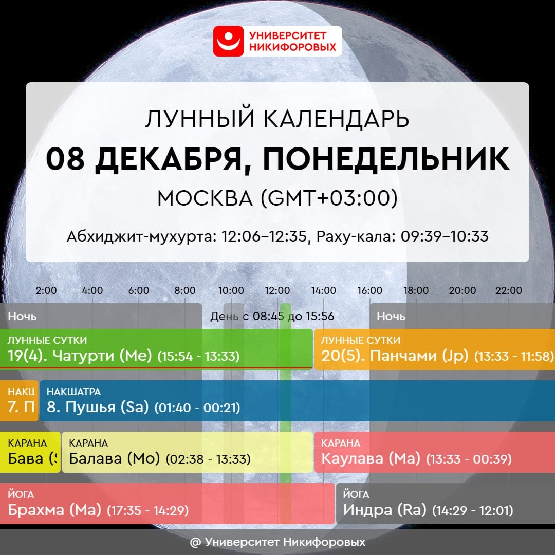 8 ДЕКАБРЯ, ПОНЕДЕЛЬНИК До 13:33 правит энергия “пустых рук” – время, когда лучше отдавать, жертвовать, а также избавляться от ненужного. Также это подходящий момент для учебы, в том числе для изучения астрологии. В работе в это время стоит отдать внимание рутинным аспектам и продолжению начатого ранее. После 13:33 энергетика дня становится более благоприятной и поддержит конструктивную деятельность. Можно совершать покупки, участвовать в мероприятиях и торжествах. Это время подходит для ухода за растениями, заботы о близких, а также для духовных практик. Хорошо будет пообщаться с мамой, уделив ей внимание и выразив почтение, если отношения это позволяют. Если по каким-то причинам это невозможно, можно обратиться с молитвой к Божественной Матери. Хороша любая деятельность, связанная с детьми, а также исцеляющая и успокаивающая.
