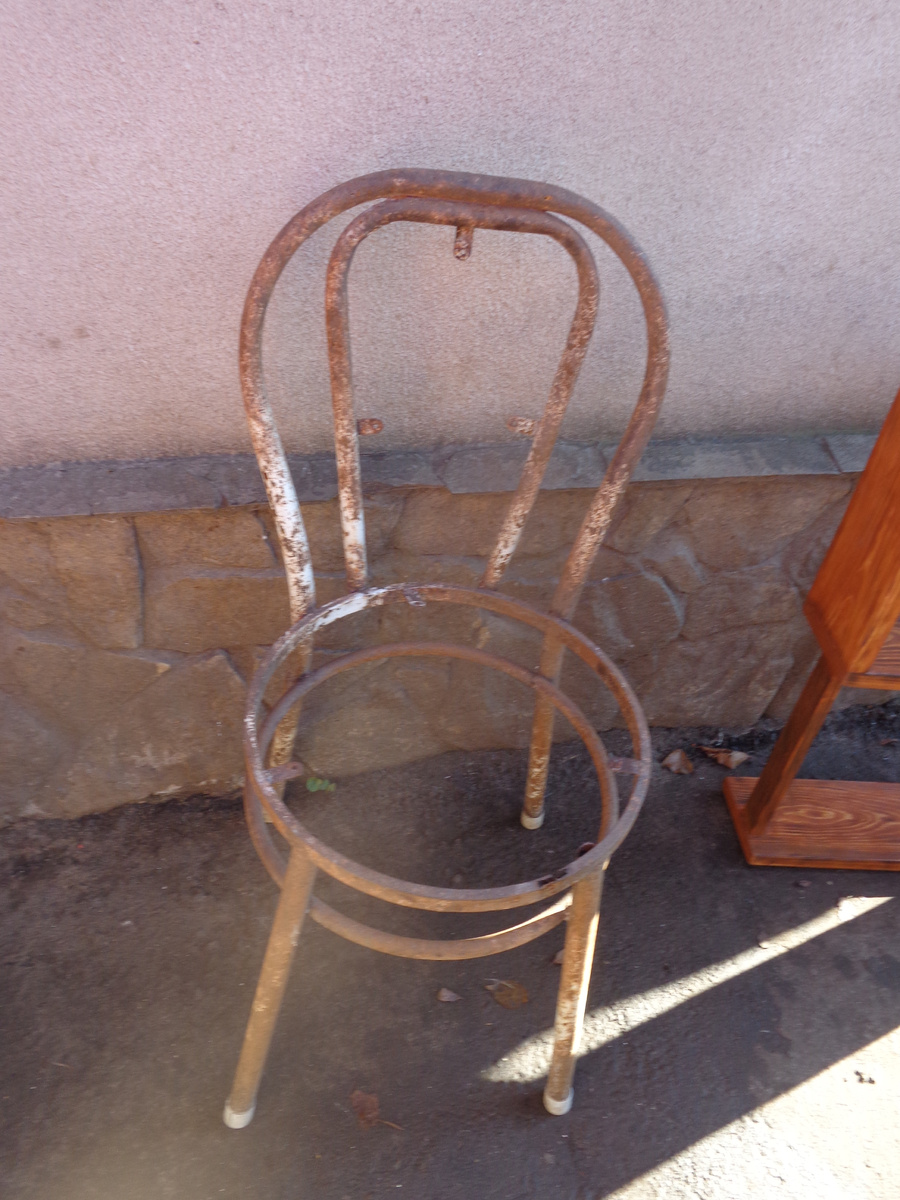 В один день, проходя утром я, увидела его. Он стаял так сиротливо, казалось, что это полный мусор, а с другой стороны я увидела вызов. Получится ли дать ему вторую жизнь или нет. И я решилась, пробуем… Этапы спасения: 1. Чистим от ржавчины и шлифуем 2. Самое не простое. Места, где метал, проела ржавчина, замазываем холодной сваркой. 3. Протираем ацетоном для того что бы краска лучше прилипла к металлу. 4. Окрашиваем. Мой выбор пал на краску по металлу, цвет «шоколад» сверху губкой добавляем акриловую краску цвет «золото». 5. Беремся за спинку и сидение. Сидение мы немного схитрим и покупаем готовую столешницу диаметром 38см. С широкой доски и такой же толщины 2,8см. доски вырезаем спинку. И закругляем ее и шлифуем шлифовальной машинкой. В моем случае это "пролежавшая" доска. Поэтому цвет ее темнее. Чтобы выровнять по цвету пришлось сильно затемнить обжигом сидушку. 6. Спинку и сидение декорируем. Декоративным обжигом, бок красим в золотой цвет. Легко шлифуем наждачной, где