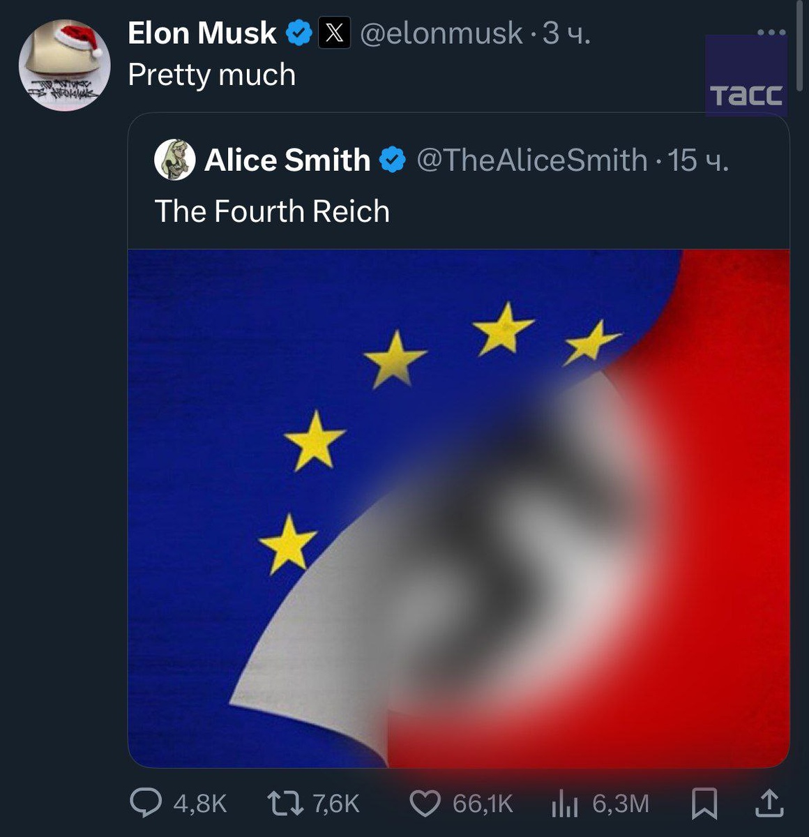 Маск наносит новый удар по Брюсселю. В ответ на провокационное изображение (флаг ЕС + нацистский флаг) он заявил, что Евросоюз всё больше напоминает «четвёртый рейх». #ИлонМаск #Евросоюз #скандал 🔔 Подпишись | 👍 Поставь реакцию | ♻️ Репост