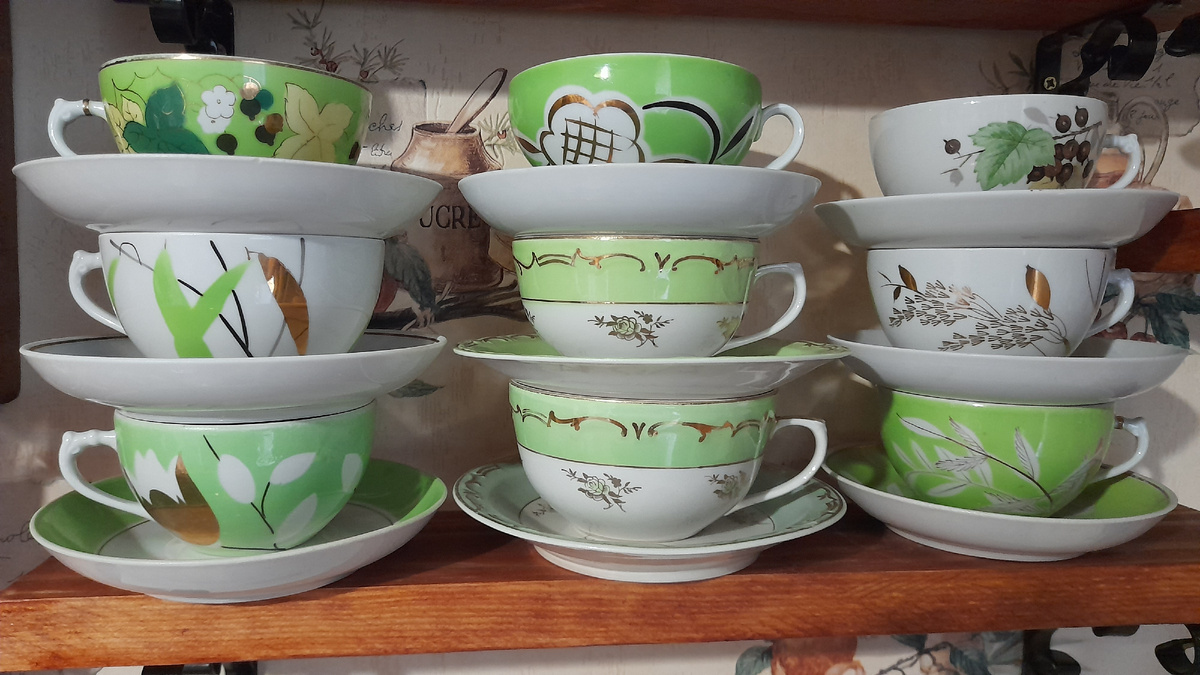 Наверное, не очень ошибусь, если скажу, что зелёный цвет у большинства любимый. Естественно, ведь это самый природный цвет, цвет зелени, весны, цвет жизни. Вот и у меня он тоже любимый. Поспорить с ним может разве что оранжевый. Но о нём в следующий раз. Когда встречаю чайные пары с зелёным крытьём или рисунком, всегда обращаю на них внимание и частенько их приобретаю. Так что у меня набралась их целая полочка.