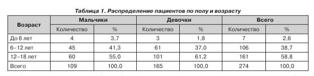 Группа пациентов, по которым составлялась документация, состояла из 165 (60,2 %) девочек и 109 (39,8 %) мальчиков в возрасте от 4 до 18 лет, средний возраст — 12,7 года (у девочек — 13,0 года и у мальчиков — 12,3 года). Для дальнейшего анализа было сформировано три группы (табл. 1).