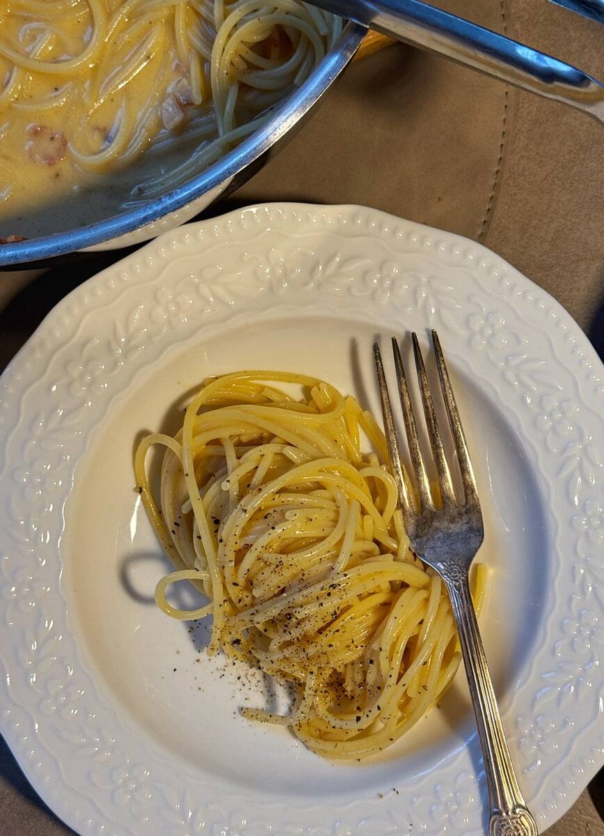 Я вам скажу, мои хорошие, нет ничего лучше, чем накатить навернуть с утра карбонару. Я проверила за вас❤️ 3 порции Спагетти 240 г в сухом виде (по 80г сухой пасты на уверенную порцию) Яйца 3 шт (только желток) Пармезан 50 г Сырокопченый бекон 5-6 полосочек (около 75 г) Чеснок 1 зуб Делается за 10 мин, я клянусь. Если вдруг нет, можете мне потом оставить гневный комментарий😇 только подготовьте сразу все ингредиенты, тогда точно все успеете. Сразу ставим на максимальный огонь большую кастрюлю с водой - 2-3 литра воды, не надо пытаться впихнуть длинное невпихуемое (я про спагетти) в мелкую кастрюлю с 200 мл воды. Сразу солим - минимум 1 ч л соли, вода должна быть соленой по вкусу, иначе паста будет пресной. Пока закипает вода, бекон достаем из упаковки, не разделяя на полоски, режем на короткие полоски толщиной 1 см. Разогреваем сковороду на огне 4 из 9, как хорошо разогрелась (поднесите ладонь близко к сковороде, вы должны почувствовать тепло), выкладываем бекон, он должен сразу зашипе