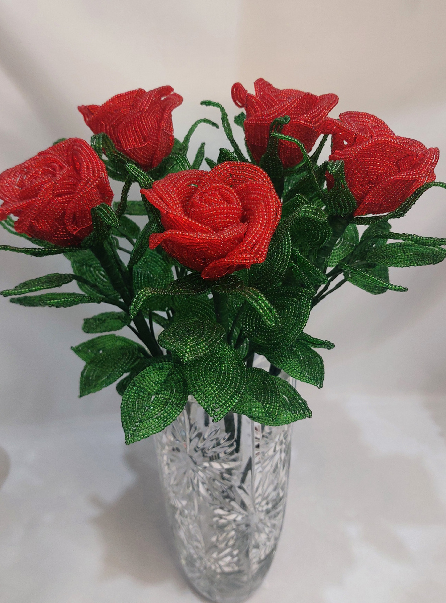 Всем доброго времени суток! В этом мастер классе я расскажу ,как сделать розочку из бисера. Для одной розы нам понадобится: Бисер ,у меня китайский размер 12,красный 90 -100 , зеленый 120 гр., флористическая лента, стержень(у меня очищенный электрод)спиннер,проволока зеленая 0.5, 0.4, 0.3.,красная 0.5 и 0.4 ,кусачки,пассатижы,ленейка,клей.Проволока 0.6 для удлинения и укрепления веточки. Начнем плести с бутона. В одной розе 11 лепестков. Три ряда лепестков плетутся одинаково, отличаются количеством кругов ,и длиной проволоки 0,5. 1 ряд лепестков 2 шт Отмеряем проволоку 0,5 18 см,складыаем на пополам ,скручиваем, оставляя 3 см сверху. Присоединяем проволоку 0,4 уже с набранным бисером, как на фото. Я всегда набираю бисер по 2-3 метра , а потом начинаю плести. На каждую ось набираем по одной бисеринки и плетем 5 кругов.Кончики проволоки проводим через крайний ряд, затягиваем и отстригаем. 2 ряд лепестков 2 шт. Отмеряем проволоку 0,5 20 см, складываем , скручиваем , сверху оставляе