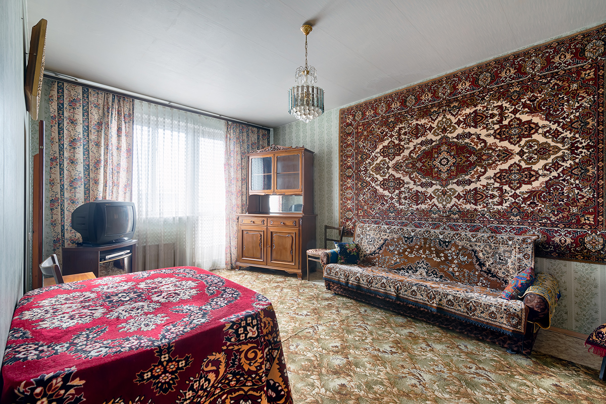 На стене висит ковёр, на окнах — одеяла, щели заклеены газетами.
