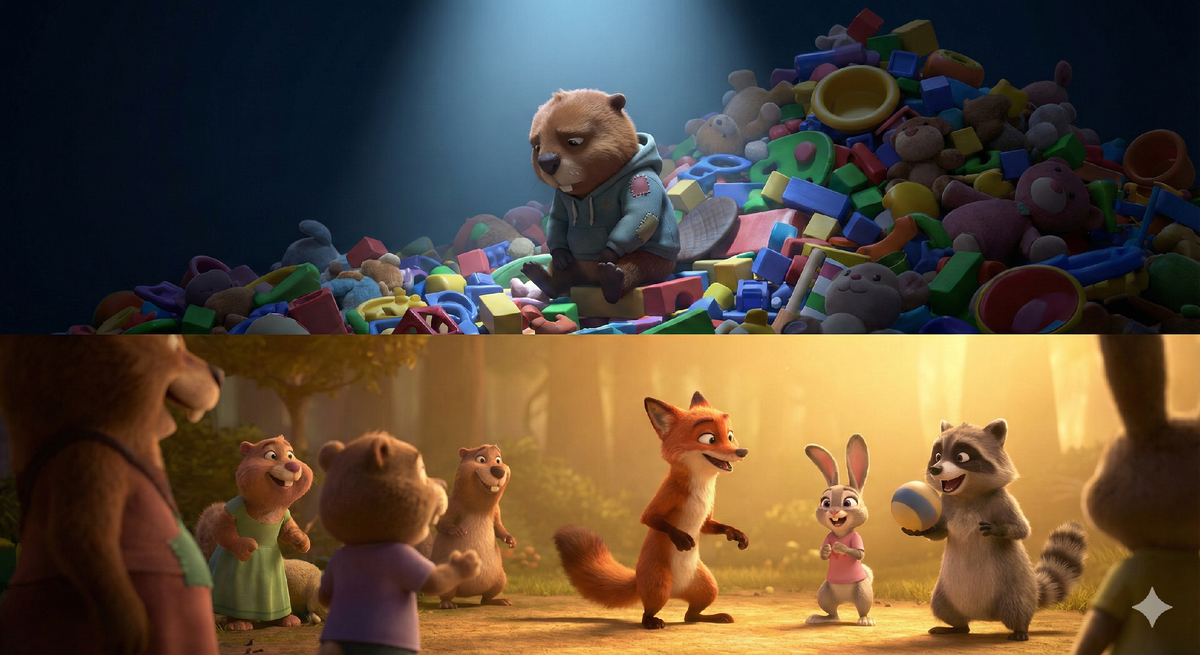 Герой сказки: Маленький [Животное: например, Бобренок] по имени [Имя ребенка], который собрал гору игрушек и сидит на них один.