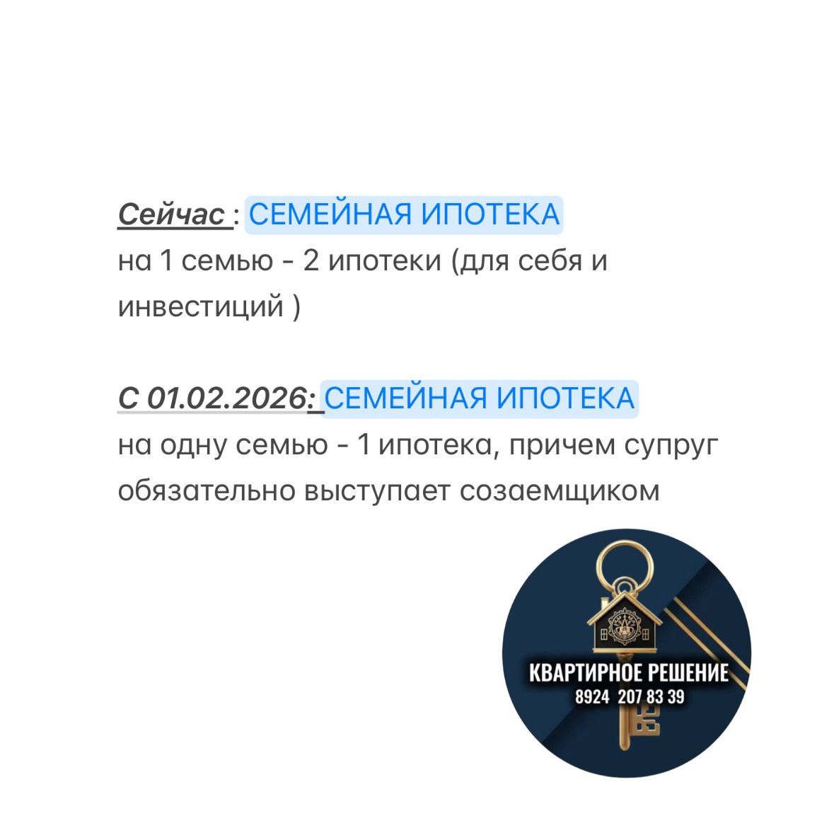 ВТОРАЯ ПО ЗНАЧИМОСТИ ЛЬГОТНАЯ ИПОТЕКА - СЕМЕЙНАЯ И здесь я рекомендую проследить путь этой программы от - "самая доступная" до "одна в руки, при чем супруг является созаемщиком в обязательном порядке". Скажу больше - эта программа станет адресной, в недалёком будущем. И ТАК, ЧТО ВЫ ПРОПУСТИЛИ: - Семейную ипотеку можно было брать в неограниченном количестве; - Подходили семьи с двумя несовершеннолетними детьми - Возможно было купить по переуступке от физического/юридического лица ЧТО ПОКА ЕЩЁ МОЖНО УСПЕТЬ? - Взять две ипотеки на семью - Взять по ставке 6%, а при определенных акциях 4.5% - Воспользоваться комбо - ипотекой и тем самым снизить ПВ до 20% и увеличить лимит ПОЧЕМУ НУЖНО ПОЛУЧИТЬ ОДОБРЕНИЕ в 2025 году? - Это возможность получить на семью две ипотеки, а не одну; - Стоимость недвижимости вырастет в цене, так как увеличиваются ставка НДС - Застройщик не может постоянно продавать из дефицита, давая вам огромные скидки, так как ему не хватит денег для того, чтобы построить д