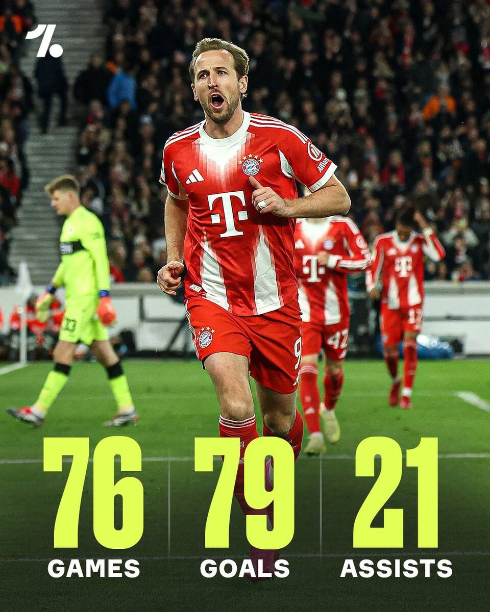 🇩🇪 Гарри Кейн сделал 1️⃣0️⃣0️⃣ результативных действий в Бундеслиге за «Баварию» всего за 76 игр... Космические цифры. До сотки он дошел во вчерашнем матче против Штутгарта. Сам Кейн сделал хет-трик, а его команда победила 5:0! В этом сезоне в чемпионате у Гарри в 13 играх уже 17 голов. У Жонатана Буркардта из Айнтрахта, ближайшего преследователя - всего 8. ⚽️ Подписывайтесь на нас в MAX