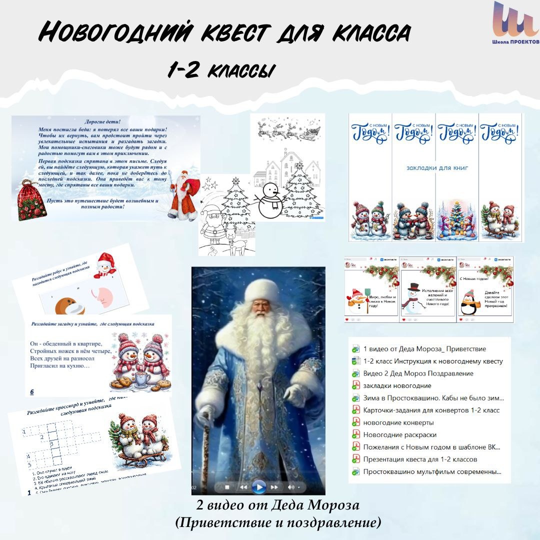 Новогодний квест для 1-2 классов 🎄🎄🎄 Квест подарит детям незабываемые эмоции, поможет объединить класс, создать атмосферу праздника и дружбы💫☃️ В набор входит: 1. Квест с заданиями 2. Инструкция проведения квеста 3. Видеоролик «Приветственное слово Деда Мороза» 4. Видеоролик «Поздравление Деда Мороза детей с Новым годом» 5. Новогодние закладки для книг –подарки для детей. 6. Карточки-задания квеста для конвертов 7. Новогодние конверты для заданий 8. Презентация квеста для демонстрации на доске. 9. Мультфильмы для показа в конце квеста 10. Зимние раскраски 11. Пожелания с Новым годом в шаблоне ВКонтакте Приобрести новогодний квест можно по ссылке: https://payform.ru/rpa2x0M/ Стоимость:190р.
