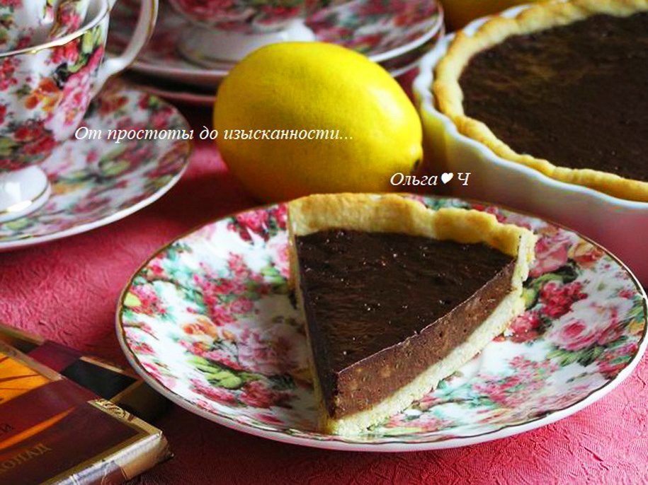 2 банана Приготовление: С лимона снимите цедру, выжмите сок, добавьте сахар, соль, растительное масло, перемешайте. Всыпьте муку с содой. Замесите эластичное тесто. Тесто распределите руками в форме (у меня 18 см), выложите сверху груз из крупы на бумаге для выпечки и выпекайте при 180*С около 15 минут. Тем временем растопите на водяной бане шоколад, добавьте бананы, размятые вилкой (можно натереть на терке, если хотите), перемешайте. Выложите шоколадный крем на основу. Выпекайте еще 15 минут. Тарт полностью остудите, уберите в холодильник на 2-3 часа до застывания. За полчаса до подачи достаньте тарт из холодильника. Нарежьте на кусочки и подавайте. Приятного аппетита! Вам также