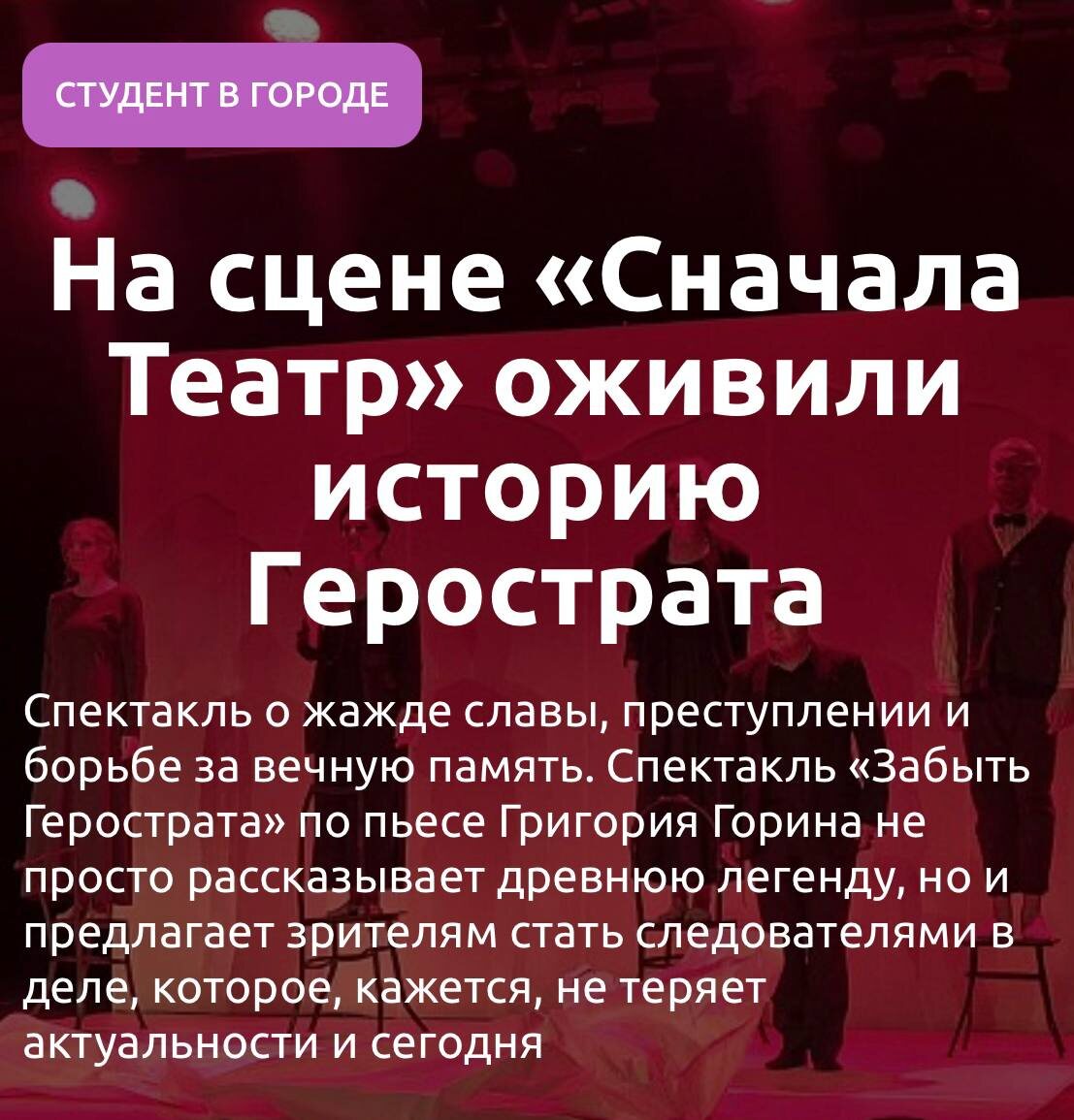 Молодежное СМИ «Первое студенческое агентство» опубликовало небольшой материал о спектакле «Забыть Герострата