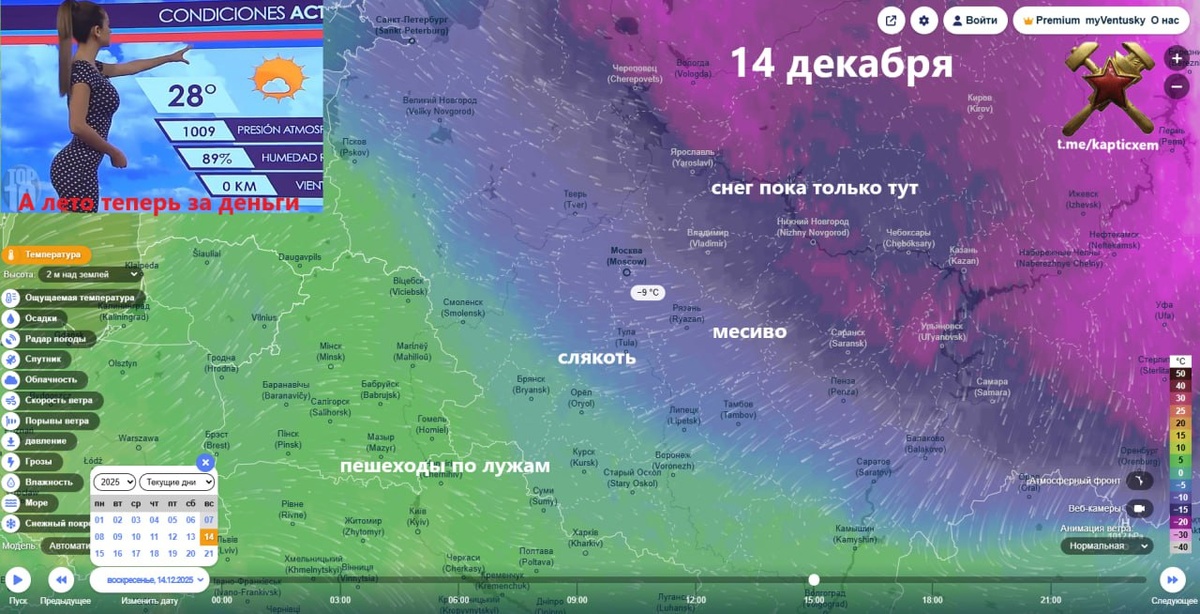 Гидрометцентр с 14 декабря рекламирует в средней полосе России наступление четкашной зимы с морозами до -9 и снегом. Так что укутываем булки и подшиваем валенки. схемы и карты