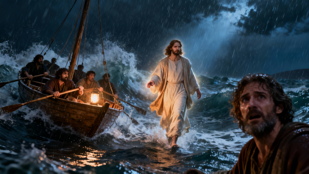 Когда Он закончил молиться, тишина горы сменилась бурей. Лодка оказалась посреди бушующего моря, а Он остался на пустынном берегу. Ученики боролись с волнами, но Он, закончив беседу с Отцом, стоял в ночной тьме, пронзая взглядом расстояние. Вдруг Он увидел их бедствующими в плавании из-за встречного ветра. Из своей высоты Он видел не только шторм, но и их усталость, отчаянные усилия на веслах. Ветер дул наперекор, и ночь тянулась долго. Но в предрассветный час случилось нечто невероятное. Он подошел к ним, шагая по воде. Не на лодке, не рассекая волны, а как по твердой земле. Он хотел пройти мимо, дав лишь знак Своей власти над стихией. Но это зрелище было слишком пугающим. Ученики решили, что видят призрака, и закричали от ужаса. Их крик был криком растерянности. После чудес с хлебом и изгнания бесов власть над стихиями показалась им знаком гибели. Тогда Он заговорил с ними: «Не бойтесь, это Я». Это было откровение: Тот, Кто идет к ним, — Тот, Кто властвует над миром и их жизнью. С