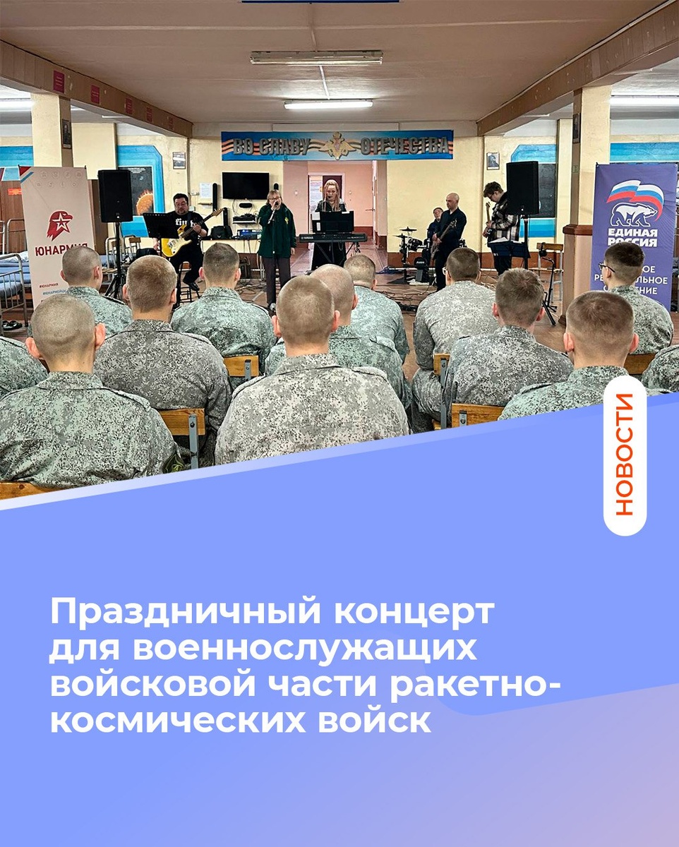 В рамках реализации партийного проекта «Единой России» «Историческая память» и в честь Дня ракетных войск и артиллерии, отмечаемого в ноябре, для военнослужащих войсковой части ракетно-космических войск, дислоцированной под Нарьян-Маром, был организован праздничный концерт. Мероприятие, инициированное при поддержке Ненецкого регионального отделения Партии «Единая Россия», прошло в последний день ноября. Несмотря на перенос из-за объявленной в части повышенной готовности, артисты и организаторы с большим уважением и ответственностью подошли к встрече с защитниками Отечества. Перед военнослужащими выступила нарьянмарская музыкальная группа «Нордбэнд» с программой, включающей патриотические композиции, в том числе посвящённые специальной военной операции, а также авторские песни, наполненные теплом и искренностью. Лидер коллектива Инга Артеева отметила: «Мы все – часть одной реальности, и не можем оставаться в стороне от тех событий и людей, которыми сегодня пишется история нашей стра
