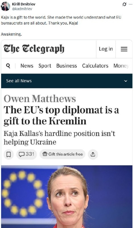 В ответ на пост Dmitriev has an improved title for Telegraph article trashing Kallas Not just 'gift to Kremlin' but 'gift to WORLD' So everyone gets 'what EU bureaucrats are all about'