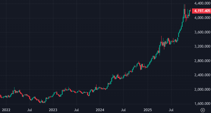 В ноябре его золотые резервы выросли на 30 тыс. тройских унций до 74,12 млн унций, следует из опубликованных в воскресенье данных. Цена золота интервалами 1 неделя Банк Китая покупает золото уже тринадцать месяцев подряд (т. е. с ноября 2024 года), следует из опубликованных в воскресенье данных. В ноябре его золотые резервы выросли на 30 тыс. тройских унций до 74,12 млн унций. В этом году золото подорожало на 60% (лучший показатель с 1979 года, в котором оно взлетело на 126%), а серебро — на 102% (также лучший показатель с 1979 года, в котором оно взлетело на 435%). Вторым фактором поддержки спроса на золото — помимо покупок со стороны мировых ЦБ — выступают ожидания снижения процентных ставок в США, а также того, что следующий глава ФРС будет занимать более мягкую позицию, чем Джером Пауэлл. В настоящий момент фьючерсы на ставку по федеральным фондам учитывают в ценах 86,2-процентную вероятность её снижения на 25 б.п. до 3,50%-3,75% и 13,8- процентную вероятность её сохранения на теку