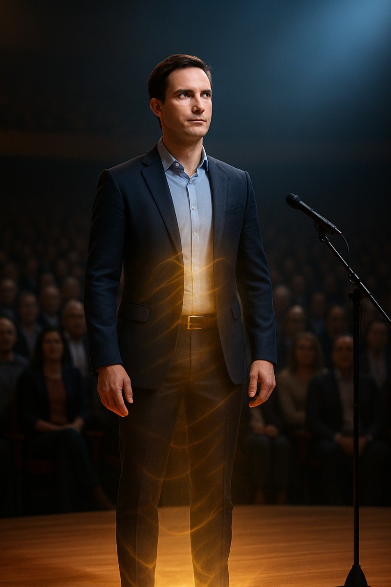 В момент волнения перед выступлением ваше дыхание сбивается, а голос становится выше. Ваша задача — «заякорить» состояние. Поставьте ноги твердо на пол, сделайте глубокий вдох животом (5 сек.), задержите (5 сек.), медленно выдохните (5 сек.). Это физически опустит вашу гортань и понизит голос. Теперь начинайте говорить. Вы будете звучать так, как будто вы хозяин положения. Сила вашего голоса определяется не связками, а тем, насколько твердо вы стоите на земле. 😀#скульптормозга