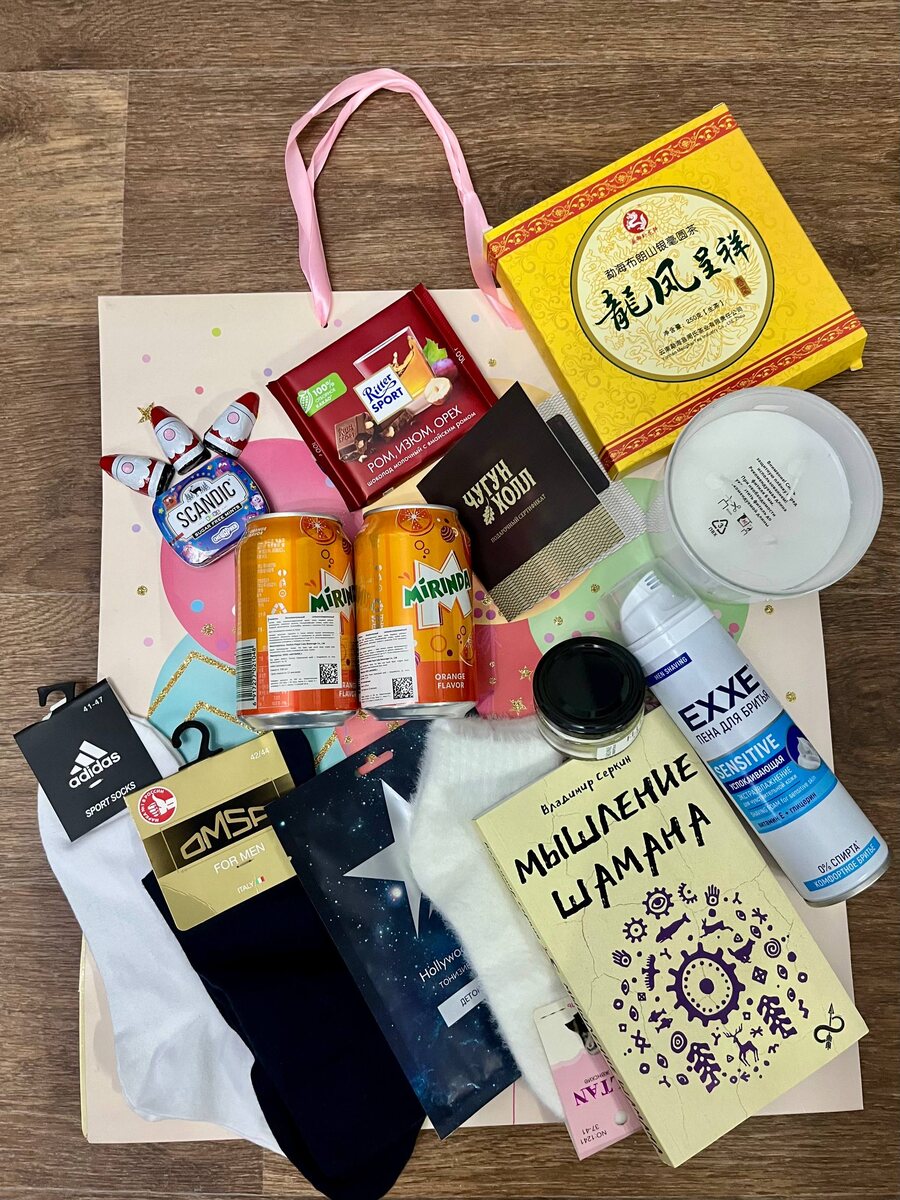 Итак, распаковка подарков на ДР : - книга "Мышление шамана" , - чай Пуэр- 250г ( выдержка 10 лет), - баночка Mirinda по 0,33 - 2 шт, -пена для бритья, - набор шоколадок Дед морозов - 3 шт, - спортивный шоколад Ritter SPORT, - леденцы SCANDIC, - набор носков - 3 пары, - маска тонизирующая для лица, - свеча малая и большая, - сертификат на банный комплекс "ЧУГУН ХОЛЛ", - медбол 4 кг ( нет на фото), - вкуснейший торт ручной работы ( его на фото уже нет). Большие спасибо за подарки, подарки -🔥ценим и любим вас❤️ #распаковка