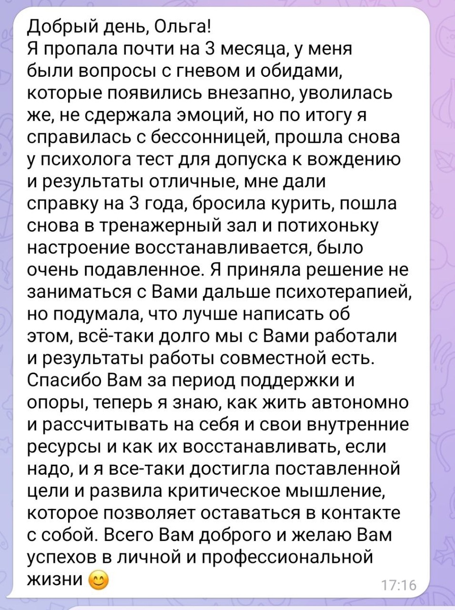 С разрешения клиента публикую отзыв. Он особенно ценен тем, что прислан спустя время, т.е. человек писал его не под влиянием сиюминутного облегчения. Он осмыслил пройденный путь, оценил свои результаты и увидел пользу от совместной работы. Желаю клиентке дальнейшего продвижения к ее целям ❤️ Пусть все складывается отлично! А вам желаю воспользоваться воодушевляющим примером и обратиться за помощью ко мне или другому подходящему психологу. И пусть нам всем станет хорошо 🙏