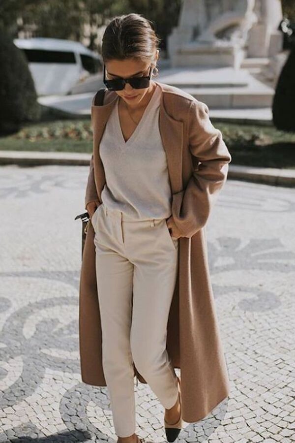 Бежевый, серый, тёмно-синий, молочный — эти оттенки делают образ благородным, даже если под пальто простая одежда.
