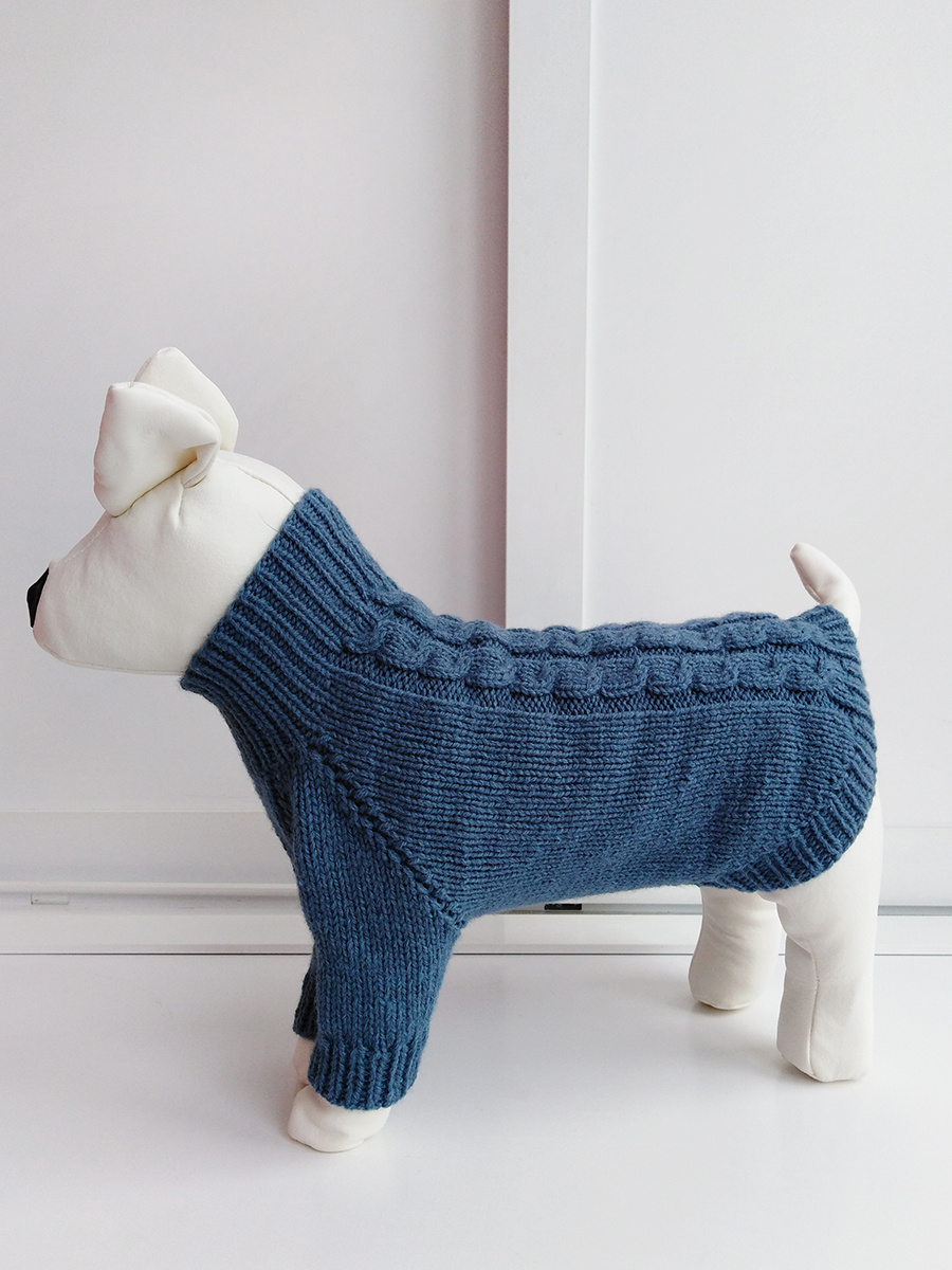 Свитер ручной работы для небольших собак и кошек связан из мягкой пряжи. Модель с рукавами реглан и слегка удлиненной спинкой. Состав пряжи туча: 50%шерсть 50%акрил. Состав пряжи секционного крашения: 20%шерсть 80%акрил Длина свитера по спинке 32-33 см Обхват груди 32-34 см Обхват шеи 21-23 см Пряжа 16/2 в 3 сложения, спицы №3. Вязание по кругу. На схеме показана половина изделия. Схема вязания свитера для собачки Набрать 64 петли, связать вкруговую около 20 рядов резинкой 1+1. Разделить петли: 14 петель на животик, 1 изнаночная петля — линия реглана, 4 лицевых петли — рукав, 1 изнаночная петля, 6 лицевых петель, *2 изнаночных, 4 лицевых — коса 2х2 через 8 рядов* повторить 4 раза, 6 лицевых , 1 изнаночная, 4 лицевых петли — рукав, 1 изнаночная. Реглан вяжется с прибавками в 6 местах, со стороны животика прибавок нет. Прибавки в каждом втором ряду — 14 раз. Снять петли рукавов на нитку или булавку для вязания. Соединить петли спинки и животика, добавив 2 воздушных петли у рукавов.