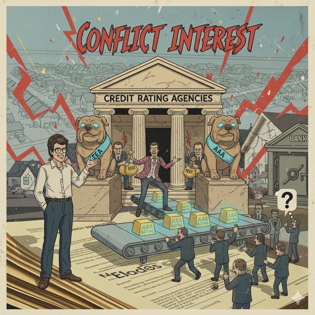 🤬 АРХИТЕКТУРА ВЕЛИКОЙ РЕЦЕССИИ Часть 8/10. Рейтинговые агентства: Конфликт интересов и ложная безопасность 📕 Чтобы финансовый конвейер работал, ему был нужен официальный контролер качества — институт, чьему слову доверяли бы все инвесторы мира. Эту роль играли кредитные рейтинговые агентства: Moody's, Standard & Poor's (S&P) и Fitch. Их печать с рейтингом ААА была золотым ключом, открывавшим доступ к триллионам долларов пенсионных фондов и страховых компаний, которым по закону часто разрешалось покупать только самые надежные бумаги. Комиссия по расследованию кризиса (FCIC) пришла к однозначному выводу: «Кризис не мог бы произойти без рейтинговых агентств. Они были ключевыми пособниками финансового краха». 💲 В основе этого провала лежал фундаментальный и неразрешимый конфликт интересов, заложенный в самой их бизнес-модели — «платит эмитент» (issuer-pays model). Инвестбанки, создававшие MBS и CDO, платили агентствам за присвоение рейтинга. Это превратило независимую экспертизу