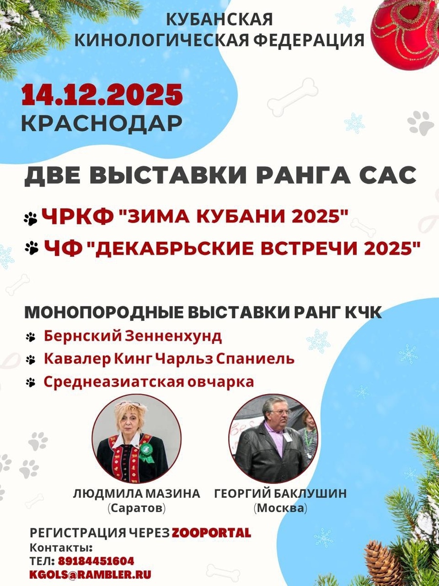 ⏰ 14 дек (7д) 🏛 #Краснодар #Россия #Выставка 🐶 Выставка собак: Зима Кубани 2025 🏆 Кубанская Кинологическая Федерация Контакты организаторов здесь: 🌐 https://www.petsman.ru/vystavki-sobak.php?mesto=34-krasnodar ❄️Выставка собак всех пород ранга ЧРКФ "Зима Кубани 2025" ❄️Выставка собак всех пород ранга САС ЧФ Декабрьские встречи – 2025 ❄️Монопородная выставка Бернский Зенненхунд 2025 ❄️Монопородная выставка Кавалер кинг чарльз спаниель 2025 ❄️Монопородная выставка Среднеазиатская овчарка 2025 🧑 👨 Эксперты: 🔹 Георгий Баклушин 🔹 Олег Худяков 🔹 Людмила Мазина