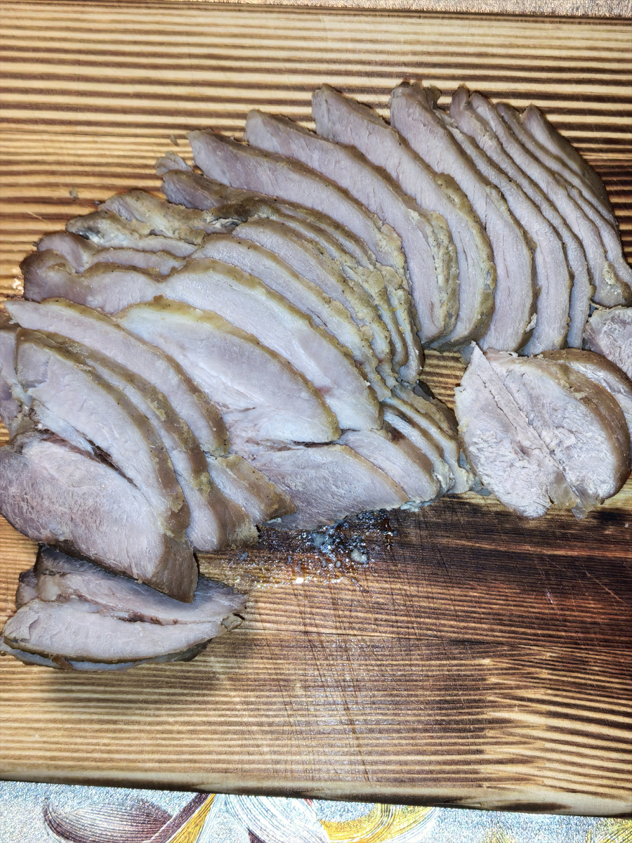 Мясо ( любое, у меня свинина самое главное убрать жир и пленки). Посолить и поперчить со всех сторон. Отдельно смешать на 1 кг мяса сухой чеснок 1 ч. л. ( можно заменить на свежий), готовую горчицу (у меня русская) 3 ст. л. Растительного масла 2 ст. л. Все хорошо перемешать. Обмазать мясо массирующими движениями со всех сторон. Убрать в пакет ( у меня вакуумный , но можно и обычный в два пакета или с зип замком) Можно убрать в морозилку расфасовать по 500 гр. И варить не вынимая из пакета и не размораживая. В холодную воду , ставим на огонь и готовим до готовности. Время варки зависит от пита мяса. Время Варки с момента закипания до готовности. Свинина 1 час. Говядина 2 - 3 часа. Курица 45 - 50 минут. Индейка 1 час. Затем вытащить из пакета. Завернуть в фольгу и убрать в холодильник после остывания хотябы на 2 часа , но в идеале на 10 - 12 часов. Подаем в качестве нарезки на праздник, на бутерброд заместо колбасы и в горячем виде с гарниром в качестве обеда или ужина. Приятного