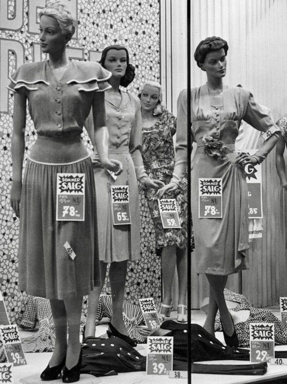 На фото платья на манекенах с ценниками в магазине в 1940х годах