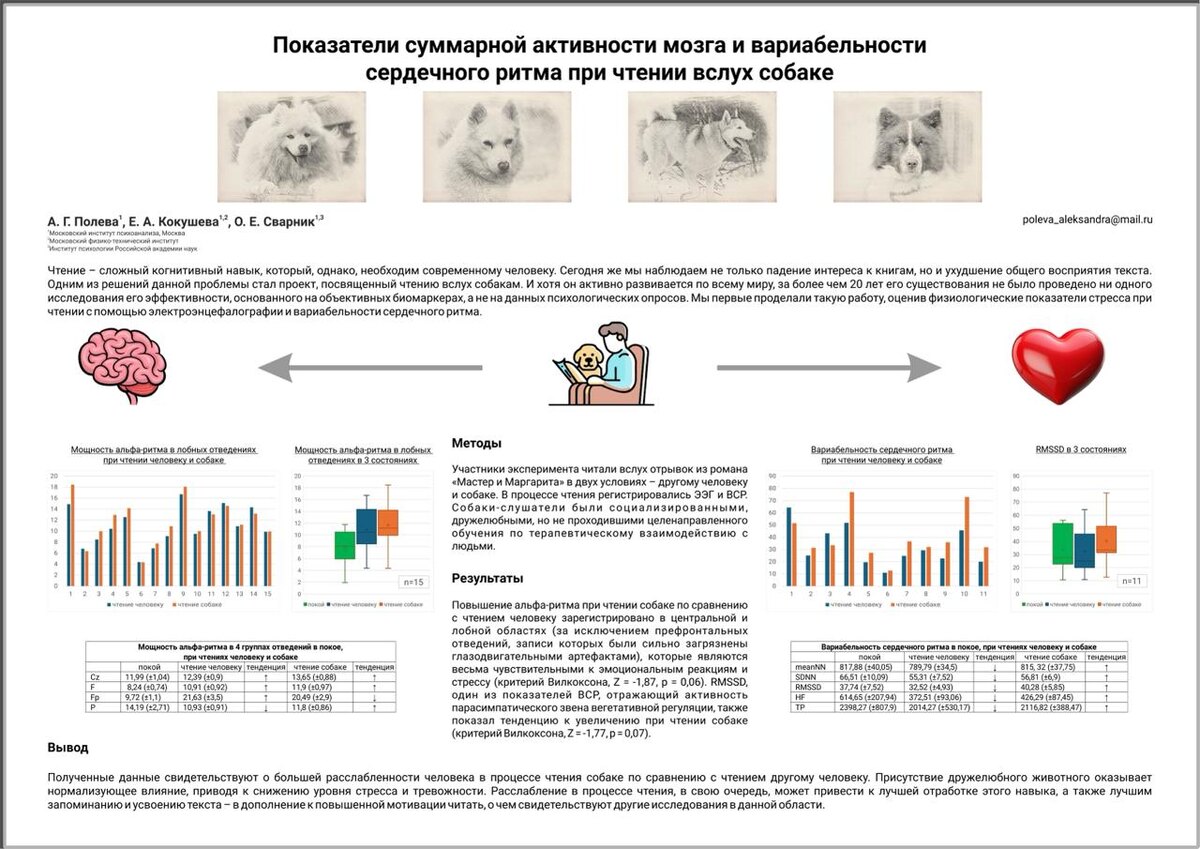 Пожалуй, основное, что я на данный момент вынесла из участия в научной конференции: 1) Искренний интерес к теме моего исследования, которую я бы глобально расширила до «физиологических коррелятов взаимодействия людей и животных» (а чтение собаке рассматривала бы как частный и наиболее формализуемый случай), и в некоторой степени даже признание научного сообщества – эти две вещи очень сильно воодушевили меня, добавили мне уверенности в себе самой и в том деле, которым я занимаюсь (это уже не просто размышления «какой-то там» девочки, которая любит животных, и даже не философия или абстрактная психология). Оказывается, для меня это было очень важным и нужным, чтобы выстроить надежный фундамент для моих идей. Возможно, именно конференция стала кульминацией всего моего обучения на нейробиолога (а вовсе не защита магистерской диссертации, которая еще впереди). 2) Знать очень-очень много и понимать (по крайней мере гораздо выше среднего), как работает человеческое восприятие, иметь опыт п