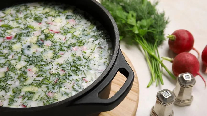 Окрошка — традиционное блюдо русской кухни, представляющее собой холодный суп на основе кваса или других жидких основ с добавлением овощей, мяса, зелени и других ингредиентов. Её название происходит от глагола «крошить», что отражает способ приготовления: все компоненты мелко нарезаются. История возникновения История окрошки уходит корнями в глубокую древность. Первые упоминания о блюдах, похожих на окрошку, встречаются в древнерусских летописях. Квас, который стал основой окрошки, был одним из самых распространённых напитков на Руси. Существует несколько версий происхождения окрошки. Одна из них связывает её появление с волжскими бурлаками. Им в качестве платы давали сушёную воблу и квас. Чтобы смягчить рыбу, бурлаки размачивали её в квасе, а позже начали добавлять овощи, найденные за день. Крестьяне подсмотрели рецепт и адаптировали его, заменив рыбу мясом. Другая версия указывает на связь окрошки с блюдом ботвинья — холодным супом из кваса с луком, рыбой и отварной ботвой свёклы