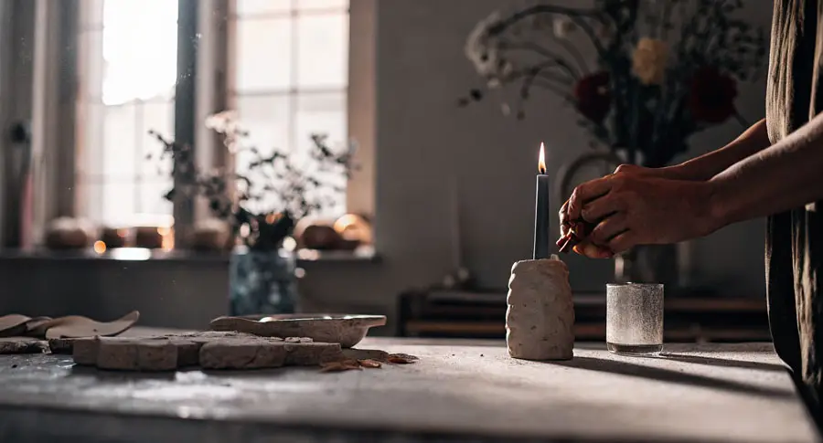 - Глина – для тех, кто хочет добавить немного изысканности и утончённости в интерьер, глина – лучший выбор. Она позволяет создать уникальные формы и текстуры. Подсвечники из глины можно раскрашивать, покрывать глазурью или оставлять в естественном виде.
