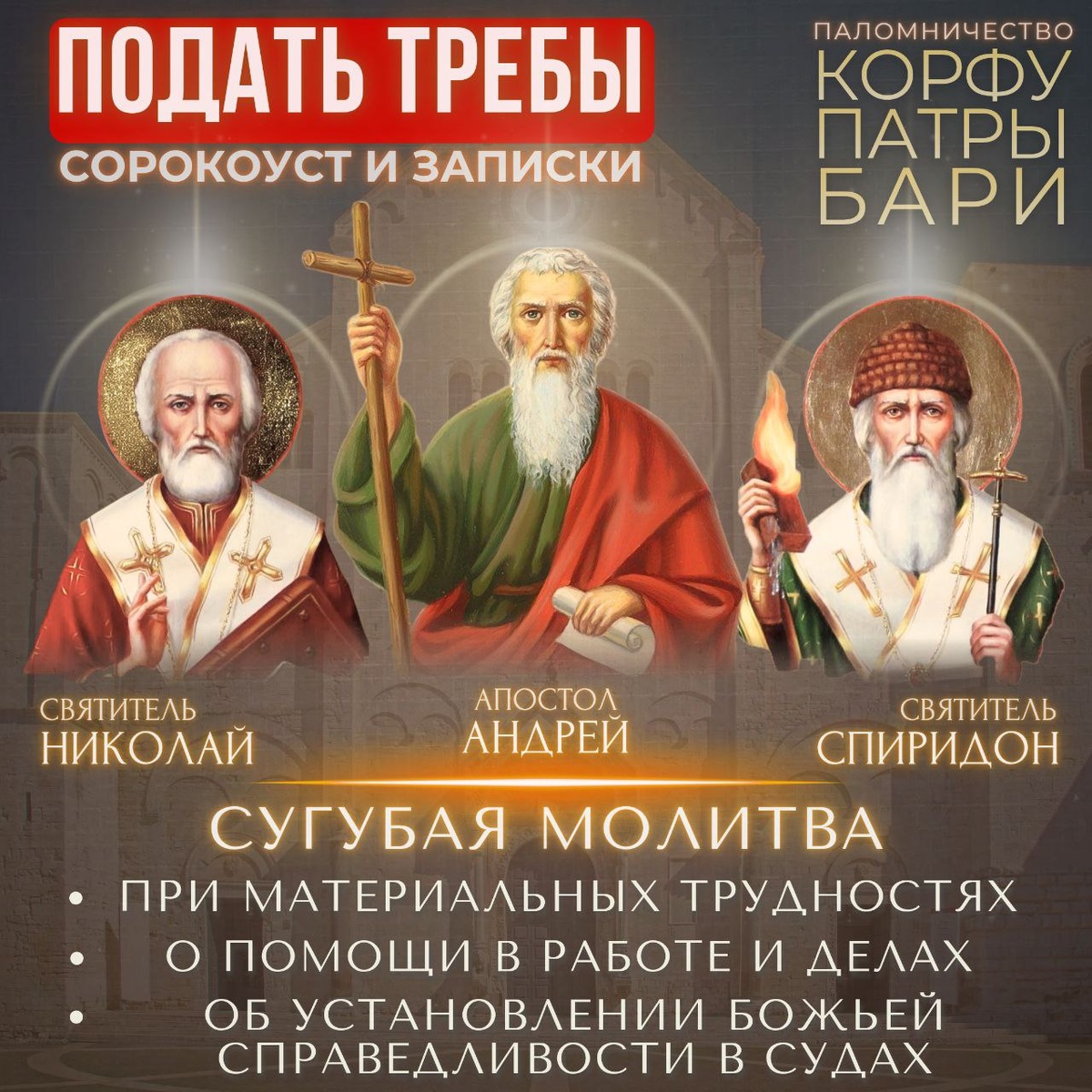 🙏 ПАЛОМНИЧЕСТВО КОРФУ — ПАТРЫ — БАРИ Десять молитв святителям Николаю и Спиридону о помощи в делах, в работе и защите в судах ⬅️ назад Дорогие братья и сестры! Начинается паломничество, в ходе которого мы помолимся: 📌 на острове Корфу — у мощей святителя Спиридона Тримифунтского 📌 в городе Патры — у мощей апостола Андрея Первозванного 📌 в городе Бари — у мощей святителя Николая Чудотворца 📅 Первые молитвы мы проведем с 9 по 12 декабря у мощей святителя Спиридона на острове Корфу, где будут проходить праздничные торжества. 🙏 Сугубая молитвы будут совершаться: — о помощи при материальных трудностях — в работе и делах — об установлении Божьей справедливости в судах ____ ✍️ Подать записки можно на сайте: 👉 spyridon-rimini.ru/treba 📌 Все имена, поданные на сорокоуст, будут помянуты во все дни паломничества 📌 Записки "В святом месте" будут однократно помянуты в один из дней 📌 Письма с просьбой или благодарностью будут оставлены 12 декабря у мощей святителя Спиридона ____