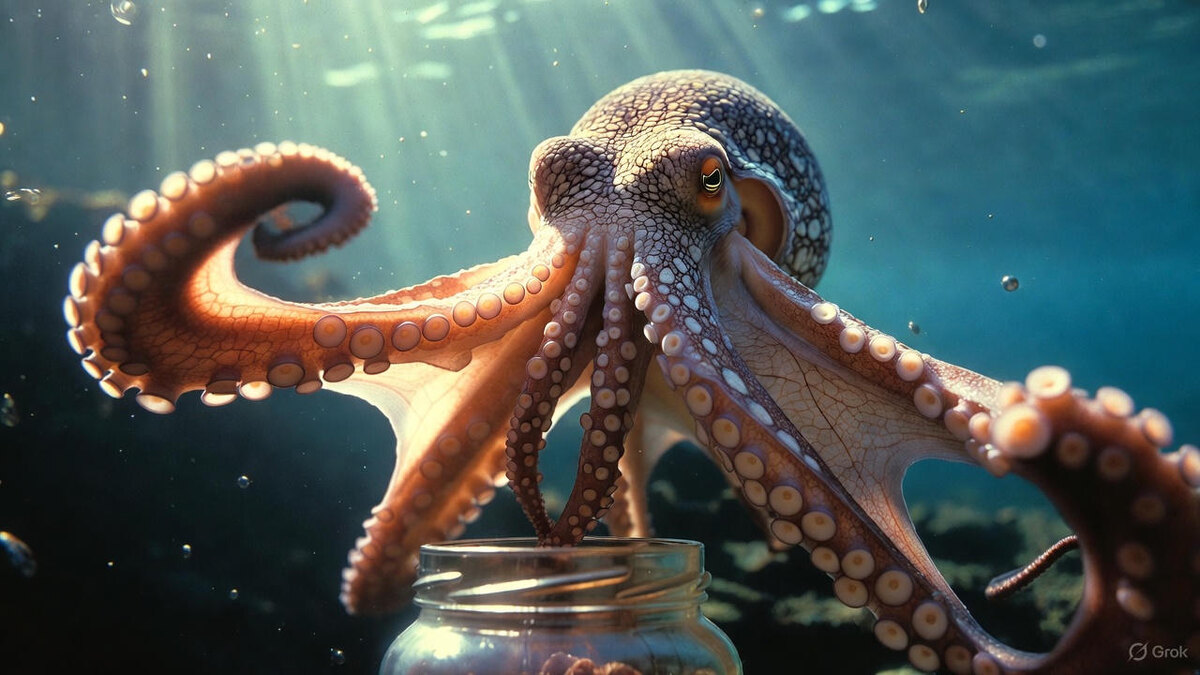 Осьминог открывает крышки, учится на ходу и решает задачки. И тут же странность: многие осьминоги живут недолго. Кажется несправедливым: зачем такие мозги на короткую жизнь? Ответ простой: ум для осьминога — не роскошь. Это способ выжить, когда времени на «детство» почти нет. 1) Он буквально “думает руками”.