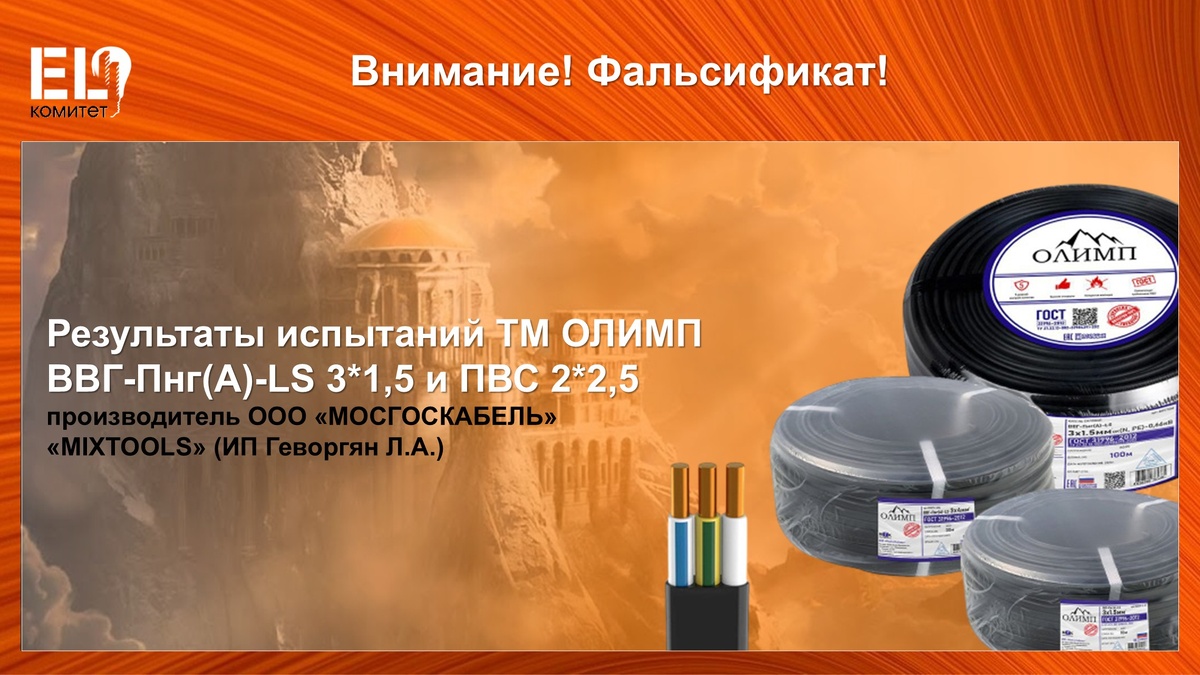 EL-Комитетом НОПСМ получены результаты испытаний образцов кабельной продукции ВВГ-Пнг(А)-LS 3*1,5 и ПВС 2*2,5 ТМ ОЛИМП (производитель ООО «МОСГОСКАБЕЛЬ», ИНН 5032338338), закупленных в магазине «MIXTOOLS» (ИП Геворгян Л.А.) в г. Москве осенью этого года. Согласно протоколам испытаний, выданным испытательным центром ООО «НПЦ РОСТ», в обоих образцах выявлены отклонения от требований качества и безопасности ГОСТ: ❌ ВВГ-Пнг(А)-LS 3*1,5 – не соответствует ГОСТ 31996-2012 по параметру «толщина изоляции ТПЖ» (отклонение 9 %); ❌ ПВС 2*2,5 – не соответствует ГОСТ 7399-97 по параметрам «толщина изоляции ТПЖ» (отклонение 42%) и «электрическое сопротивление ТПЖ» (отклонение 4%). Реализация кабельной продукции ТМ ОЛИМП сопровождается действующим сертификатом соответствия ЕАЭС RU С-RU.АБ53.В.05484/22, выданным ООО «Центр электротехнических испытаний». EL-Комитет НОПСМ уже направил в данный орган по сертификации требование о необходимости проведения внепланового инспекционного контроля по сертифицир