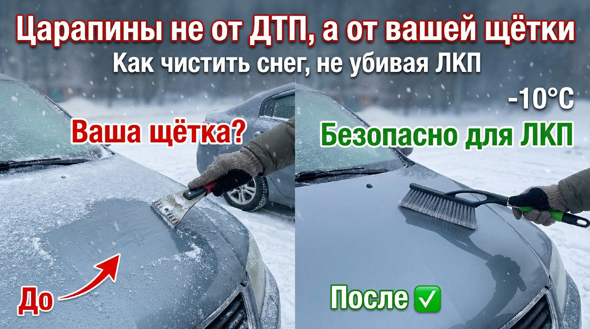 Она не видна сразу… но блестит под солнцем — и убивает презентабельность. 3. Щётка с жёсткой щетиной «Зато снег летит!» — да, но вместе с ним — восковой слой, керамика, вся защита ЛКП.