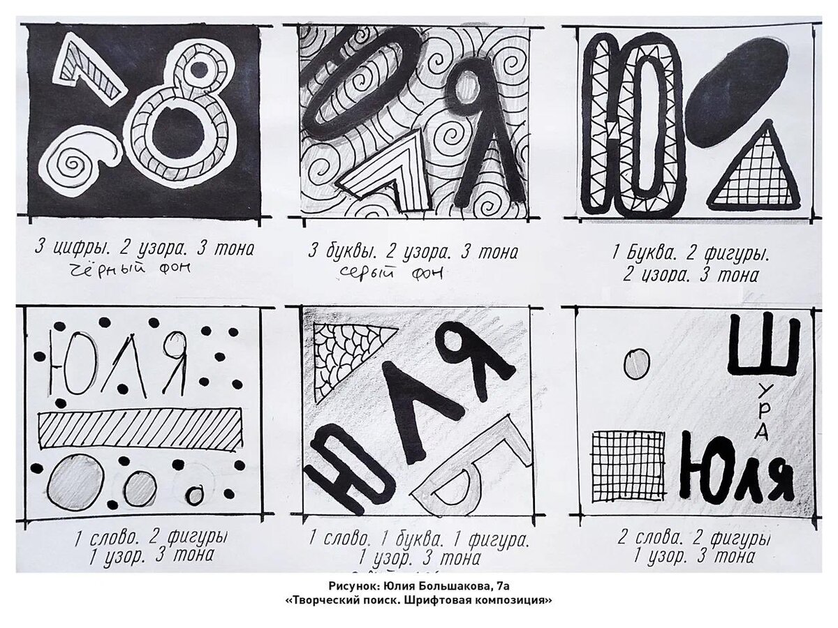 ШРИФТОВАЯ КОМПОЗИЦИЯ 🖌 На уроках изобразительного искусства шэповцы погрузились в мир графического дизайна. Осваивая законы композиции, ребята экспериментировали с различными подходами к созданию шрифтовых работ. Семиклассники смело сочетают разнообразные шрифты, орнаменты и формы, добиваясь гармонии и выразительности в своих композициях. Особое внимание на занятиях уделяется осмыслению ключевых принципов композиции в работе со шрифтами. Ученики постигают тонкости симметрии и асимметрии, учатся создавать как статичные, так и динамичные композиции. Всё это позволяет им добиваться равновесия и эмоциональной насыщенности работ. 👉 На выставке можно увидеть, как тщательно ребята прорабатывают тональные отношения и варьируют размеры элементов. Это наглядно демонстрирует их понимание важности взаимодействия всех компонентов композиции для создания целостного художественного произведения. Шрифтовая композиция стала для наших юных дизайнеров источником вдохновения. Она помогла ребятам глу