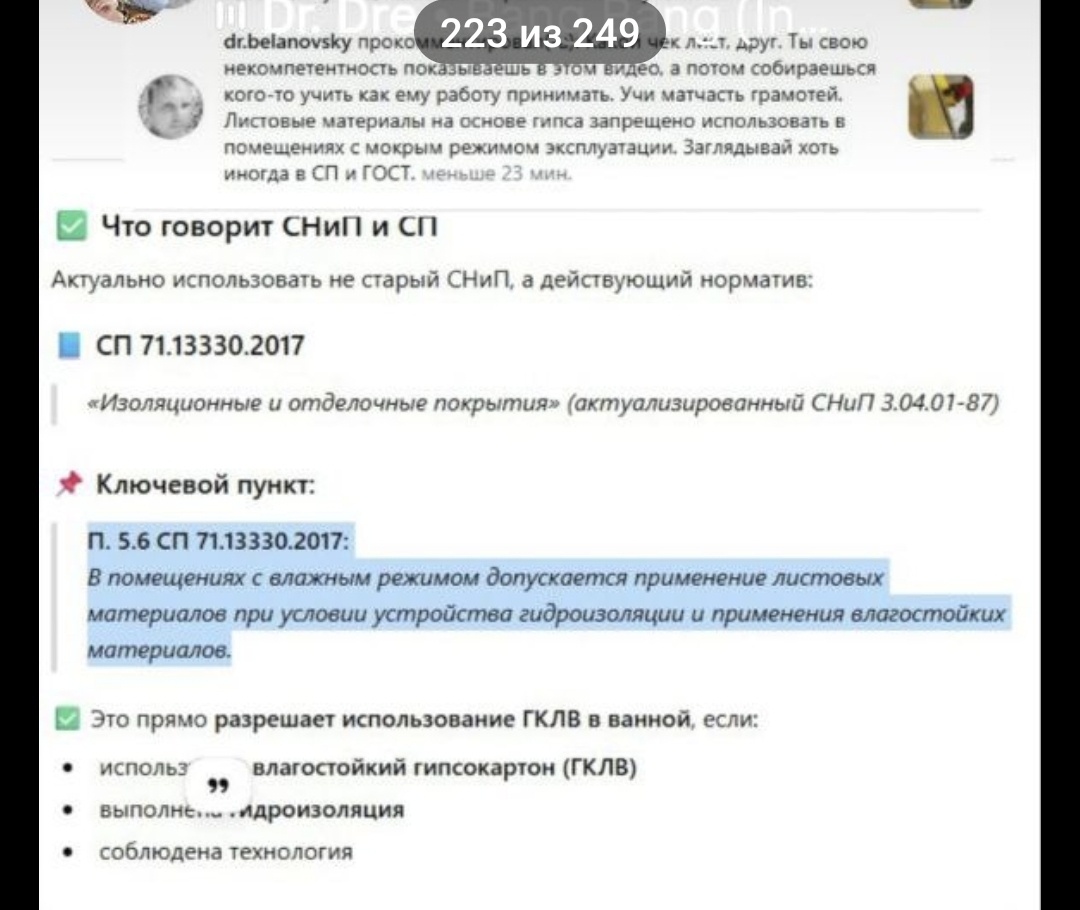 Выше упомянутый пункт 5.6 из СП 71.13330, только огромным усилием воли можно признать доказательством "Применения зелененького гипсокартона в ванные комнаты"