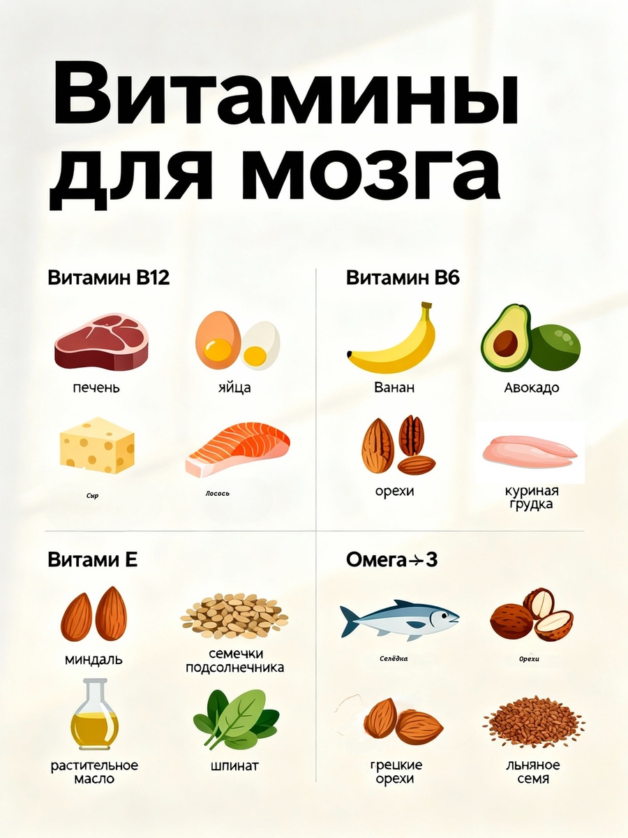 Привет, друзья! Хотите, чтобы память работала как суперкомпьютер, а голова была ясной даже в самые загруженные дни? Хорошая новость: помочь мозгу можно с помощью правильного питания. Давайте посмотрим, какие «помощники» стоит добавить в рацион. Витамин B12 — настоящий защитник нервных клеток. Он помогает лучше концентрироваться и не терять нить разговора посреди фразы. Найти его можно в печени, яйцах, жирной рыбе (например, в лососе) и сыре. Витамин B6 работает как антистрессовый щит: прогоняет «туман в голове» и помогает организму вырабатывать те самые «гормоны счастья». Запаситесь бананами, авокадо, орехами и куриной грудкой — в них этого витамина немало. Витамин Е — главный антиоксидант, который бережёт мозг от преждевременного старения и разных неприятностей. Ищите его в миндале, семечках, шпинате и растительных маслах. А ещё вашему мозгу очень пригодится Омега‑3 — это своего рода строительный материал для мозга. Она улучшает связь между нервными клетками, помогая быстрее сообра