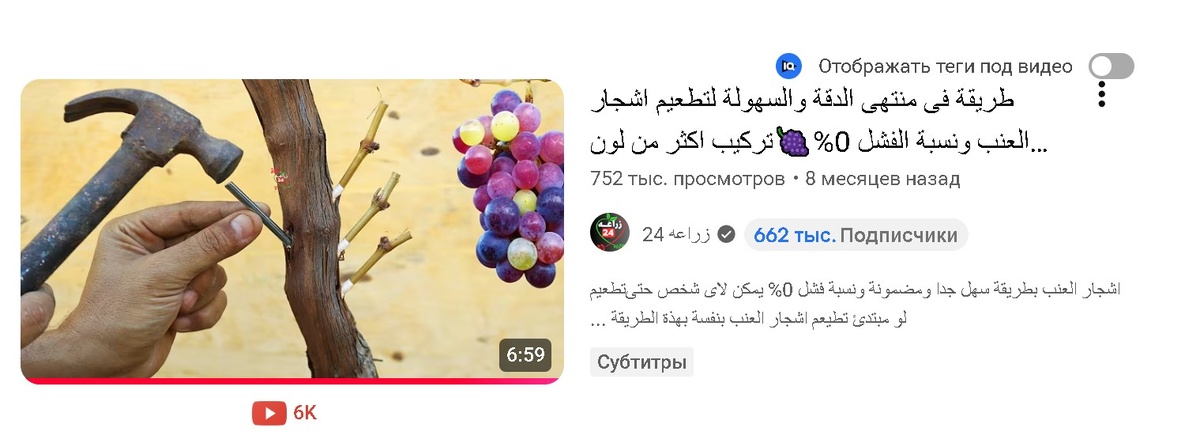 На фото хорошо виден штамб, в который вставлены череночки. Чтобы не было сомнений о каком растении идёт речь - справа виноградная гроздочка. Одна "деталь" меня заинтересовала сразу, но о том, что меня зацепило расскажу чуть позже. Посмотрел что за канал. В переводе с арабского - "Сельское хозяйство 24".