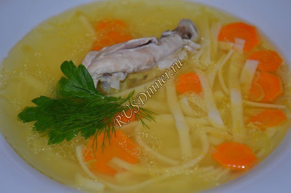 Куриный суп с домашней лапшой Ингредиенты: Вода - 4000 мл. Курица - 1000 гр. Домашняя лапша - 300 гр. Морковь - 200 гр. Лук репчатый - 2 шт. Масло растительное - 30 мл. Соль - 7 гр. Перец черный молотый - 3 гр. Источник: https://rusdinner.ru/page/kurinyj-sup-s-domashnej-lapshoj